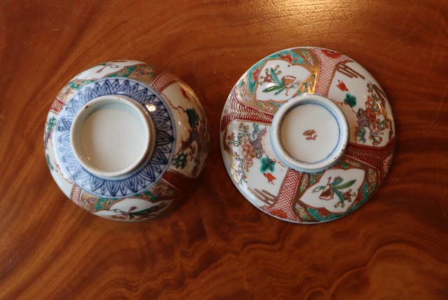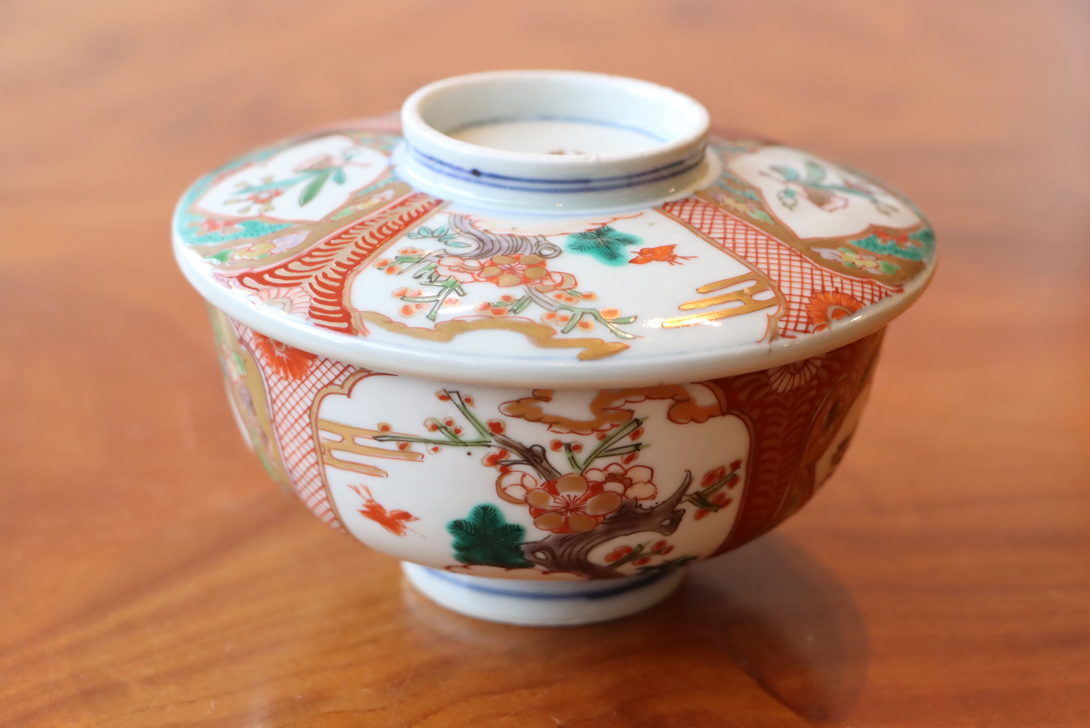 伊万里焼 色絵 松竹梅扇面文 蓋茶碗 通りもの