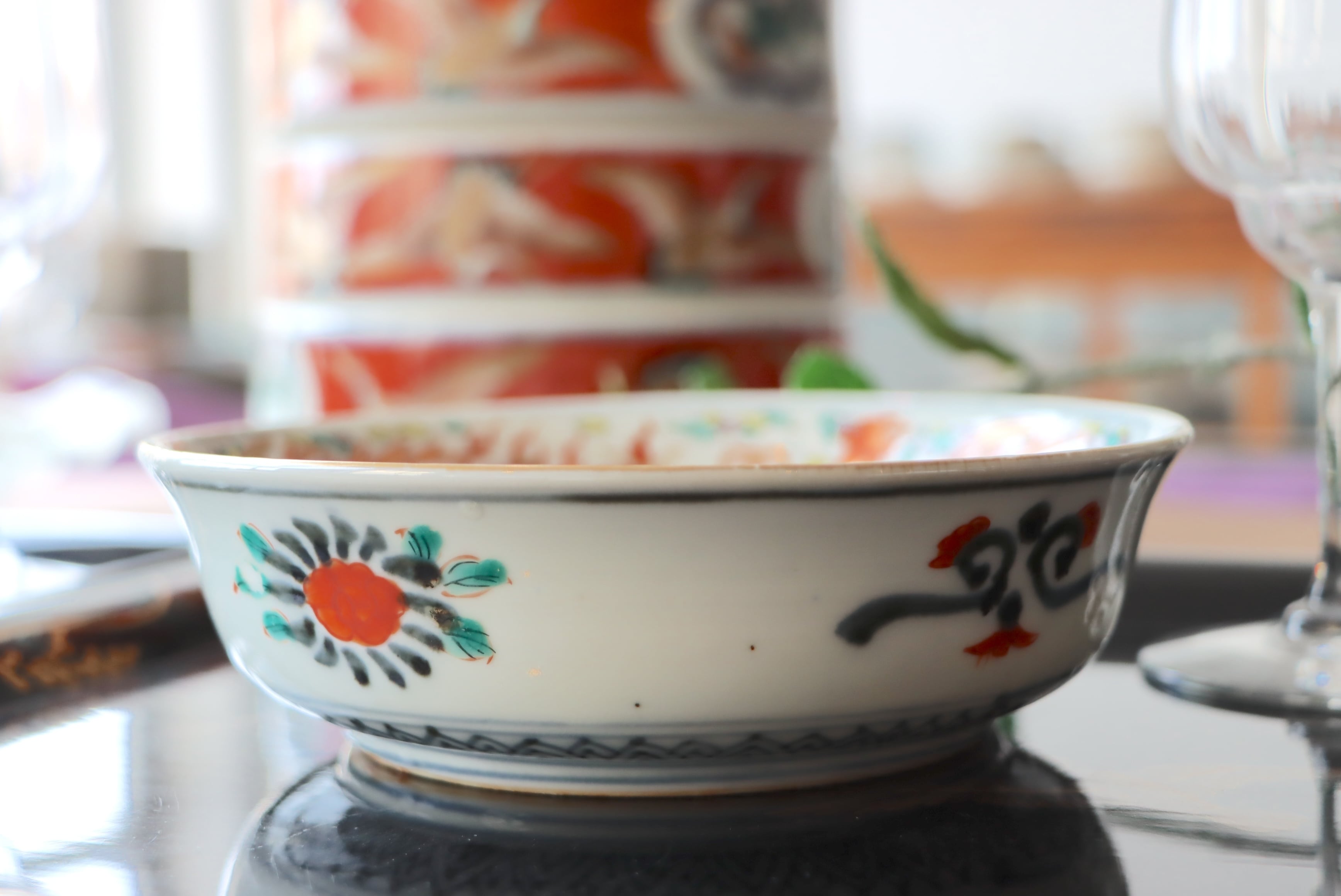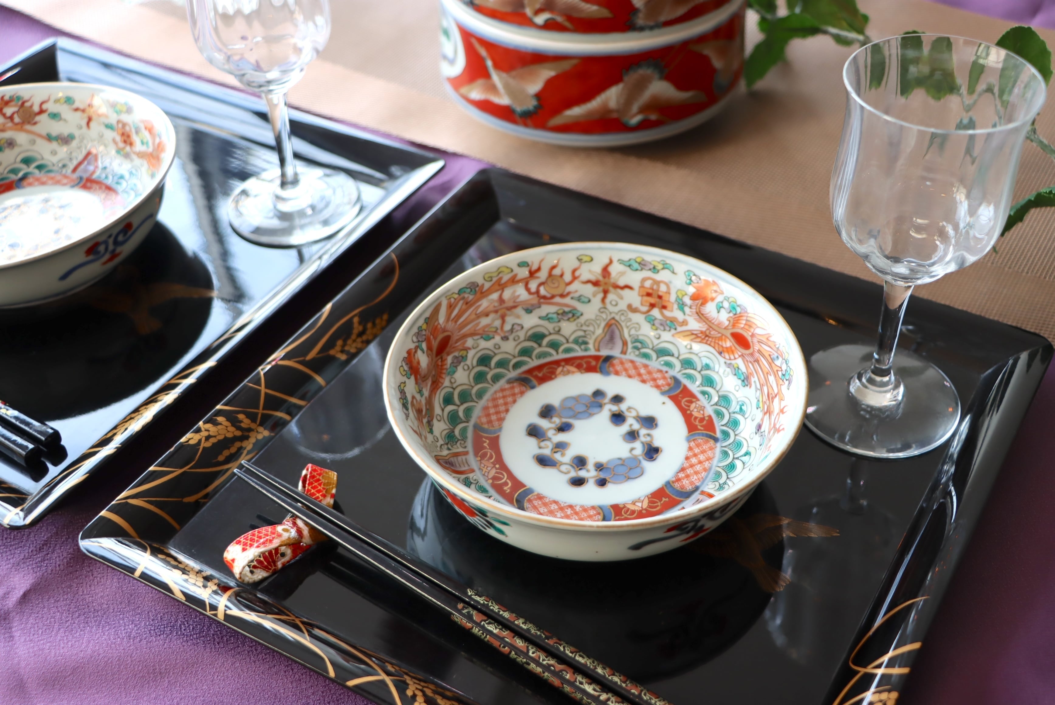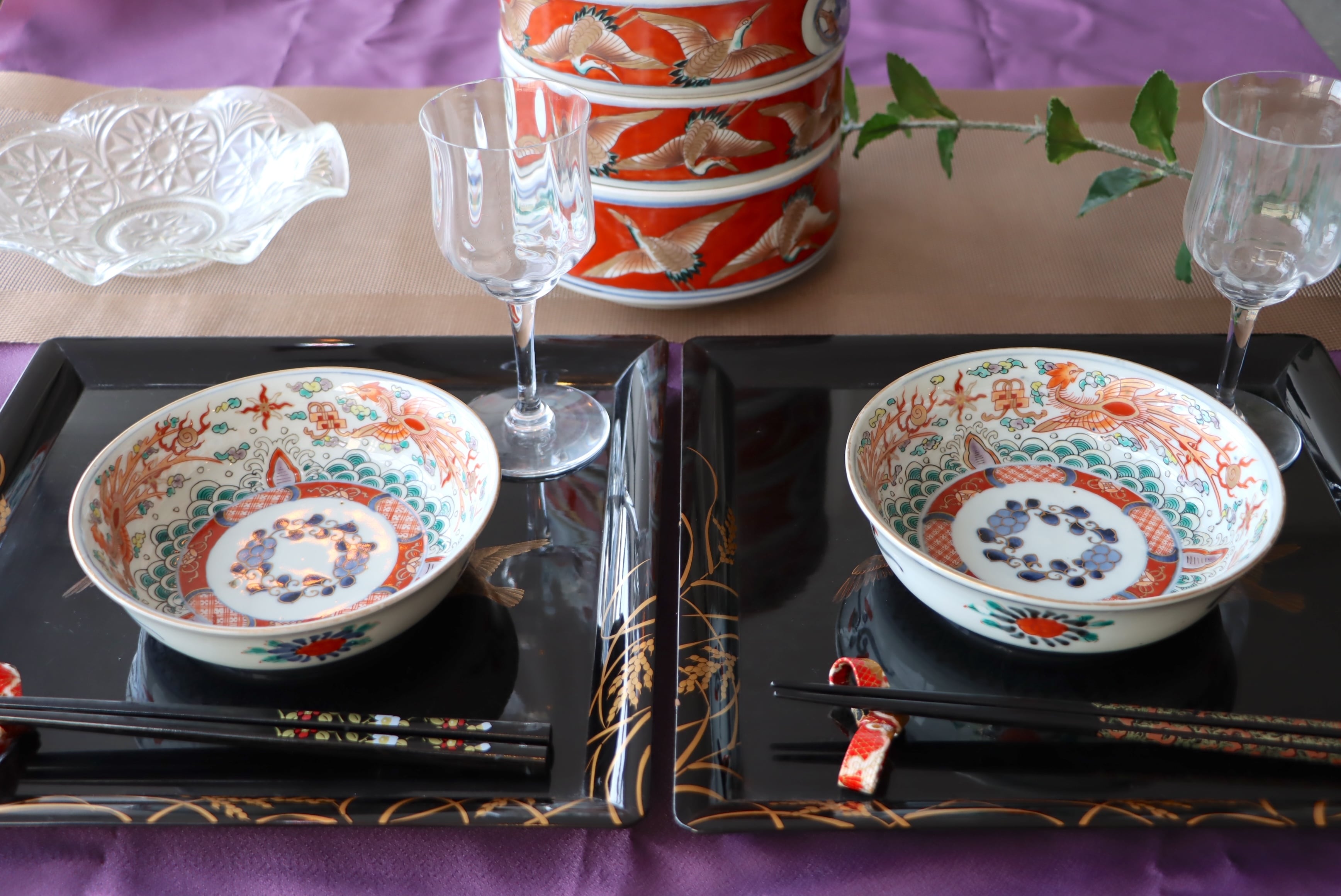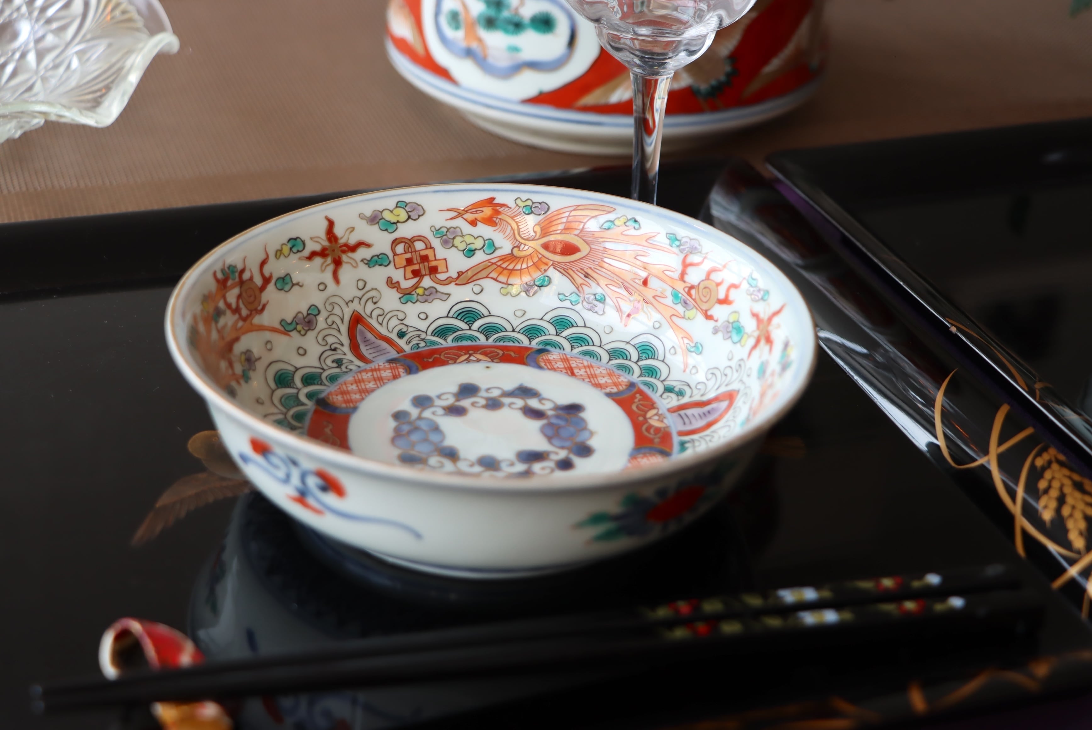 波文や宝尽くしが重なり合い、明るく晴れやかな印象で、お正月の器にぴったりです。