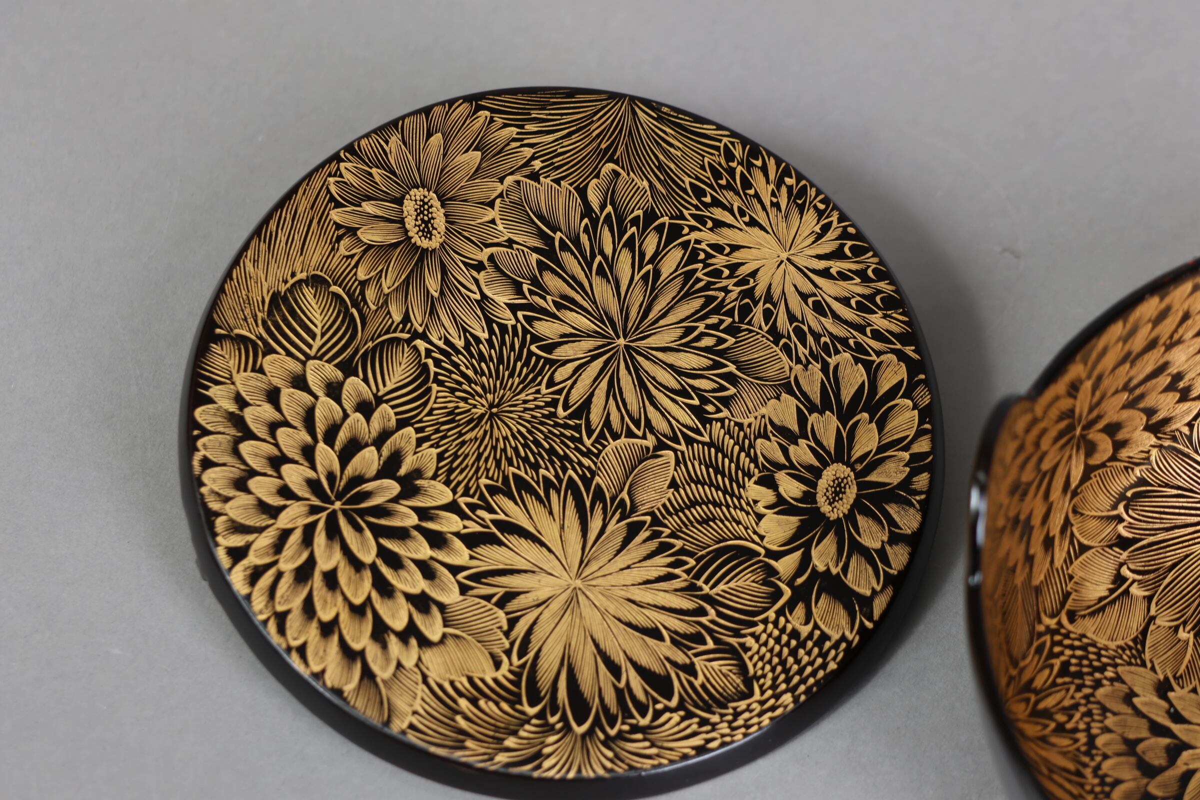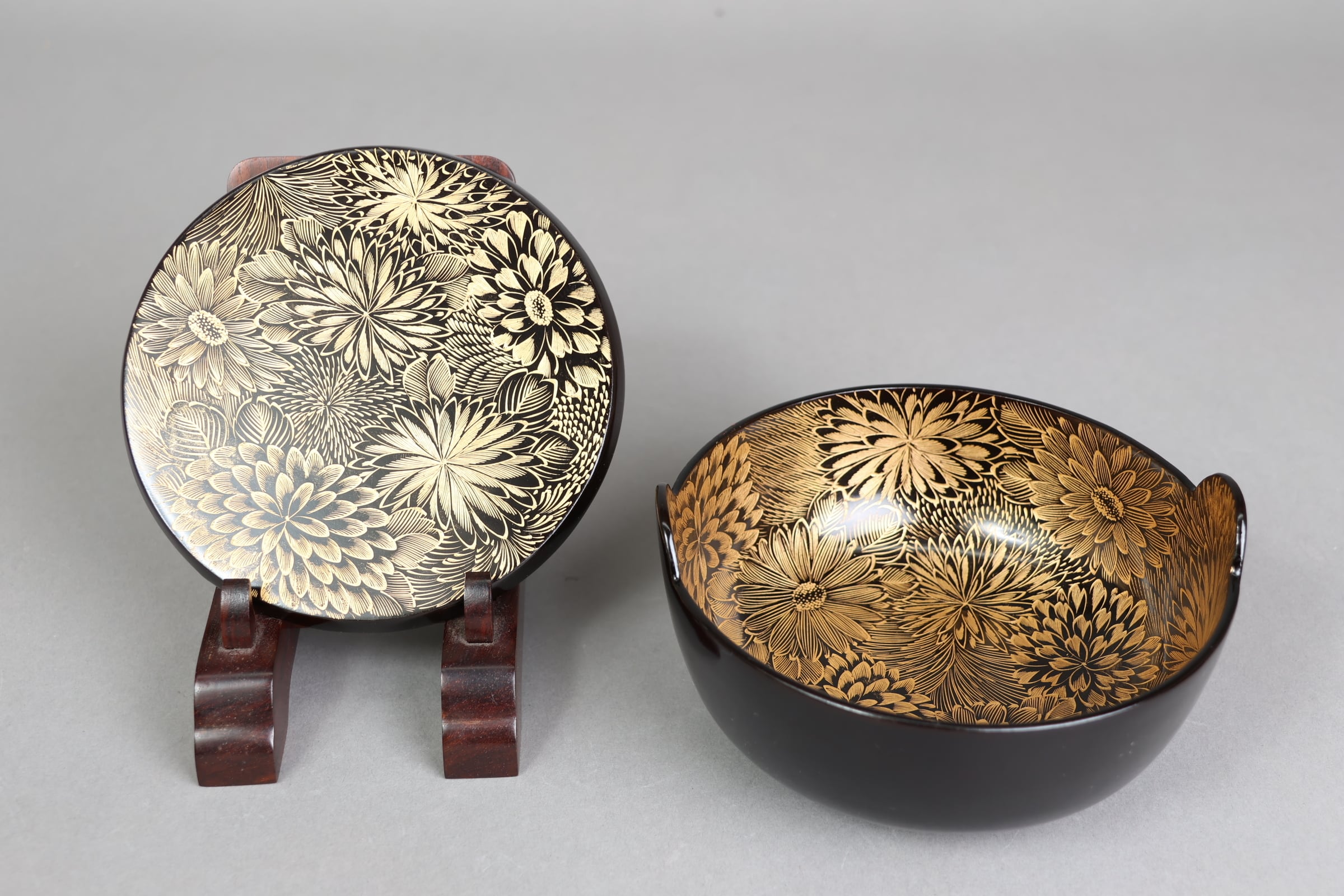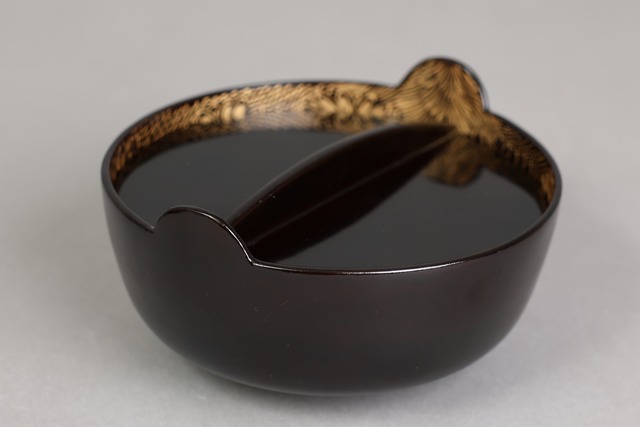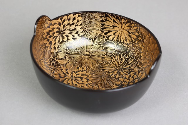 日本の伝統技法である沈金蒔絵を用いた、美しい蓋付きの椀です。