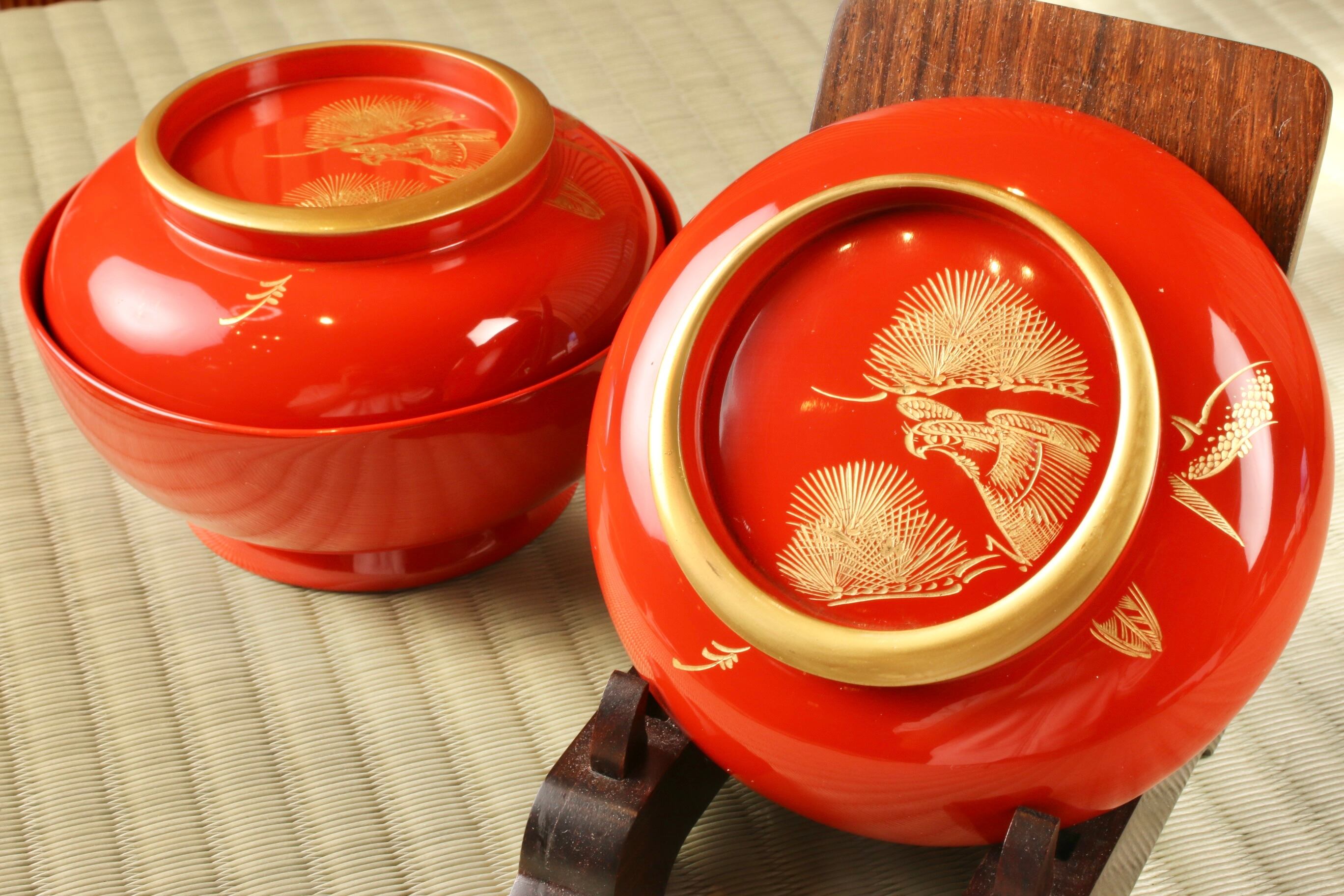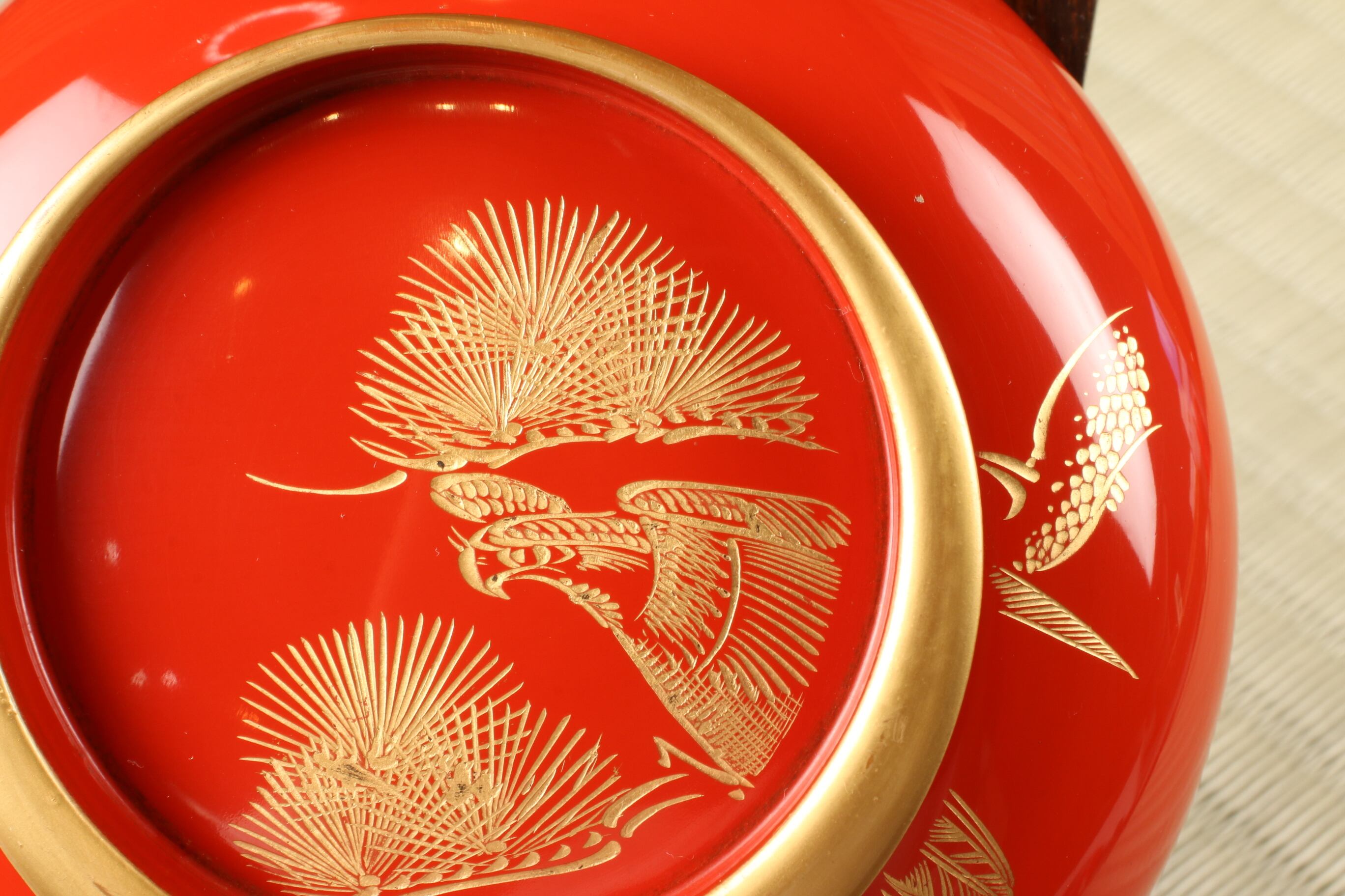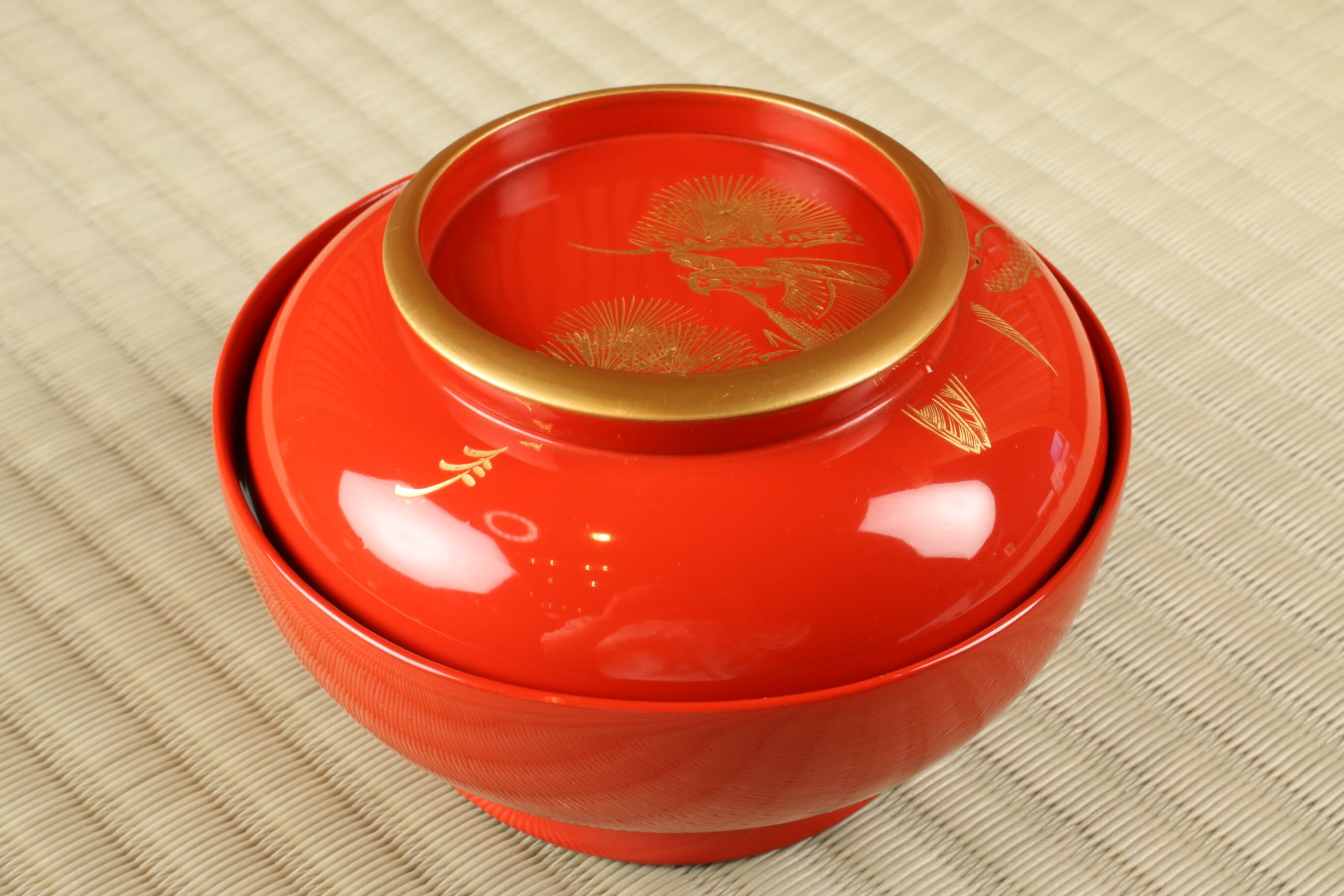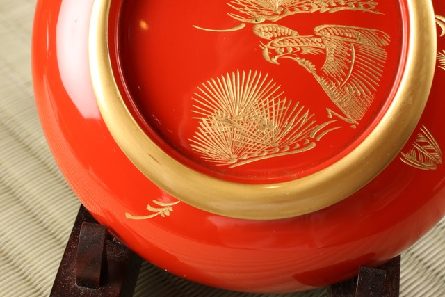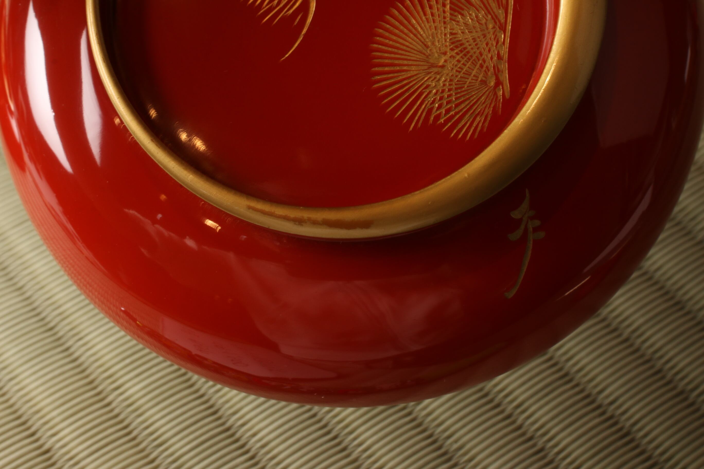 輪島塗 朱塗 沈金 木堅地 三日月 松鷹蒔絵 蓋椀