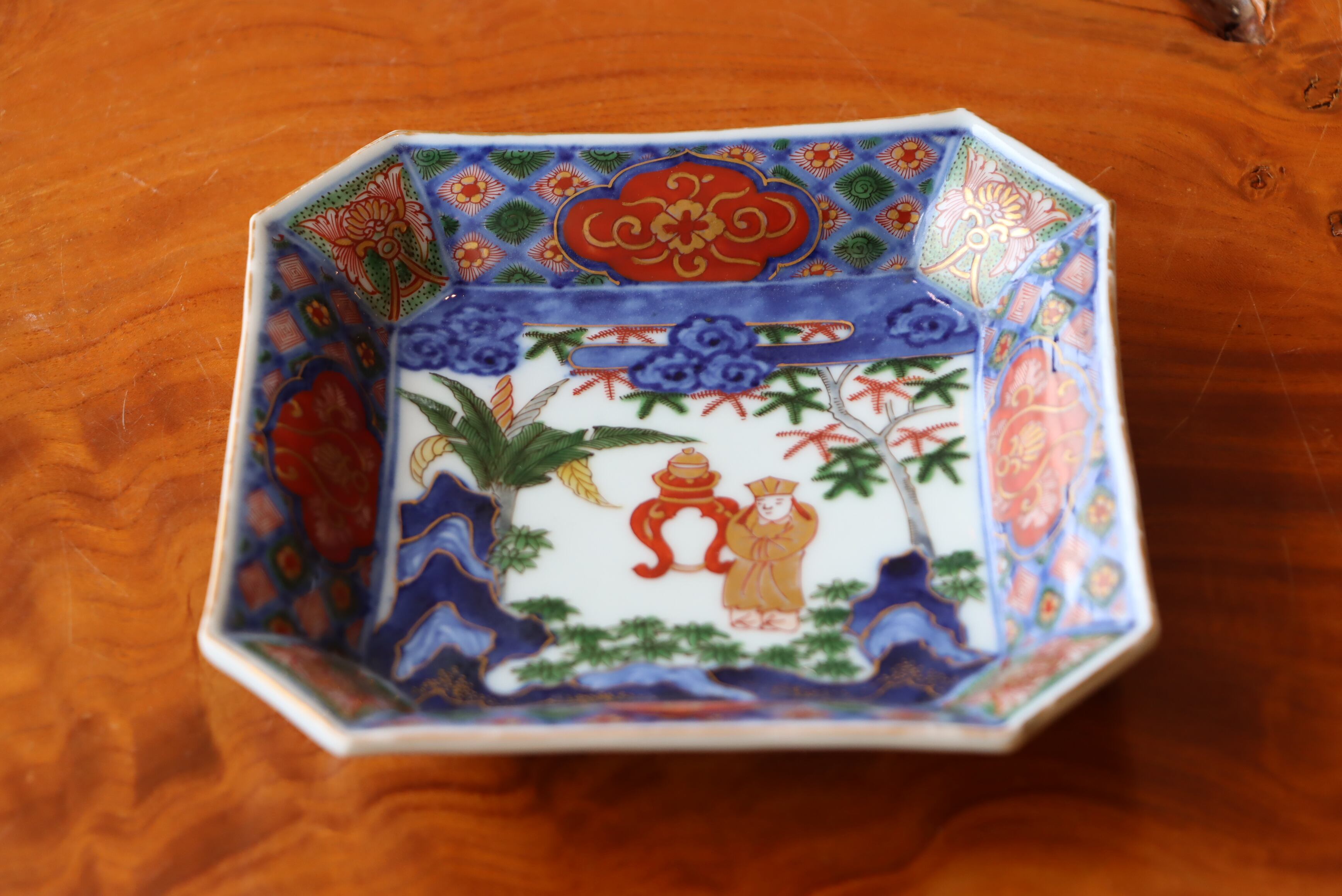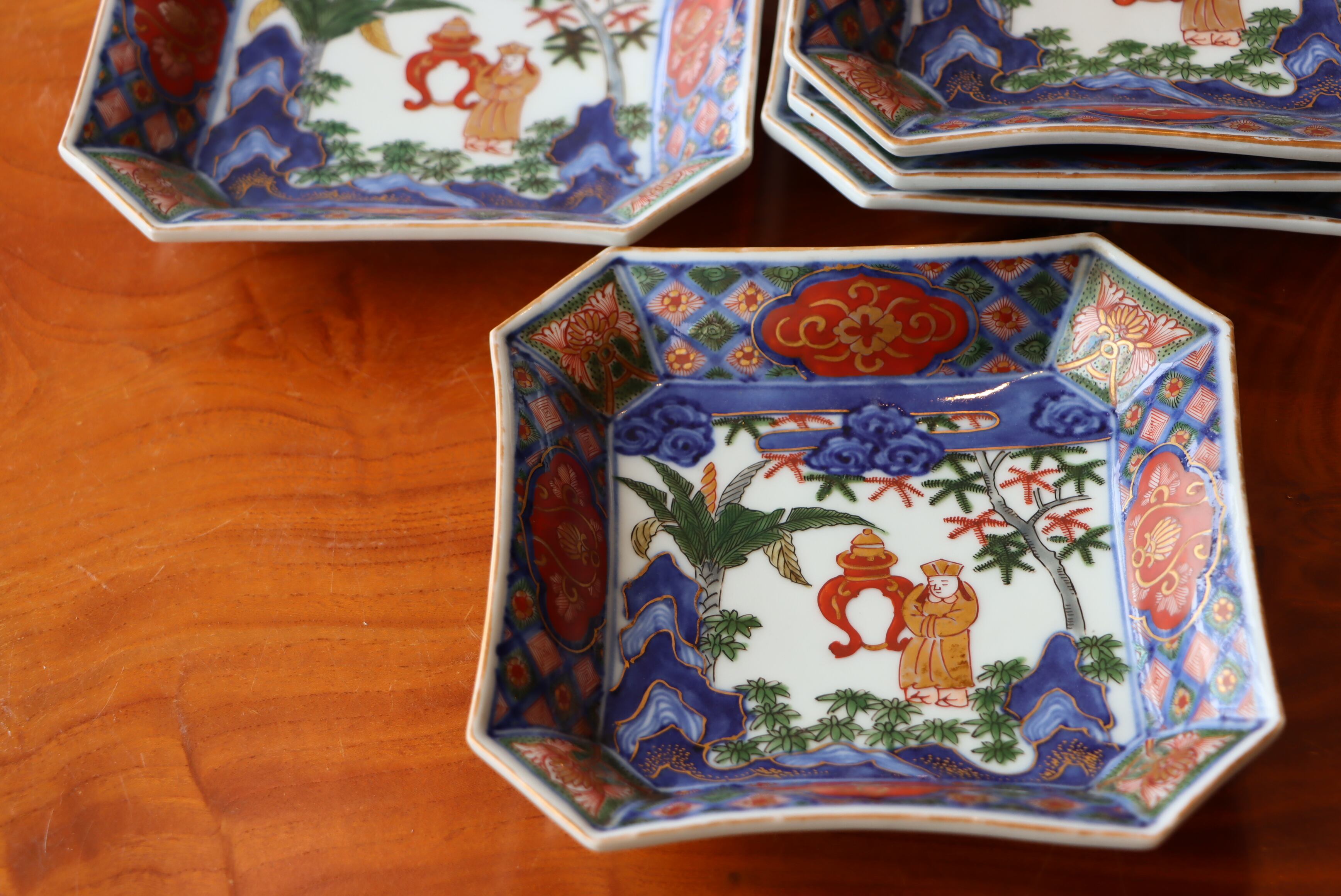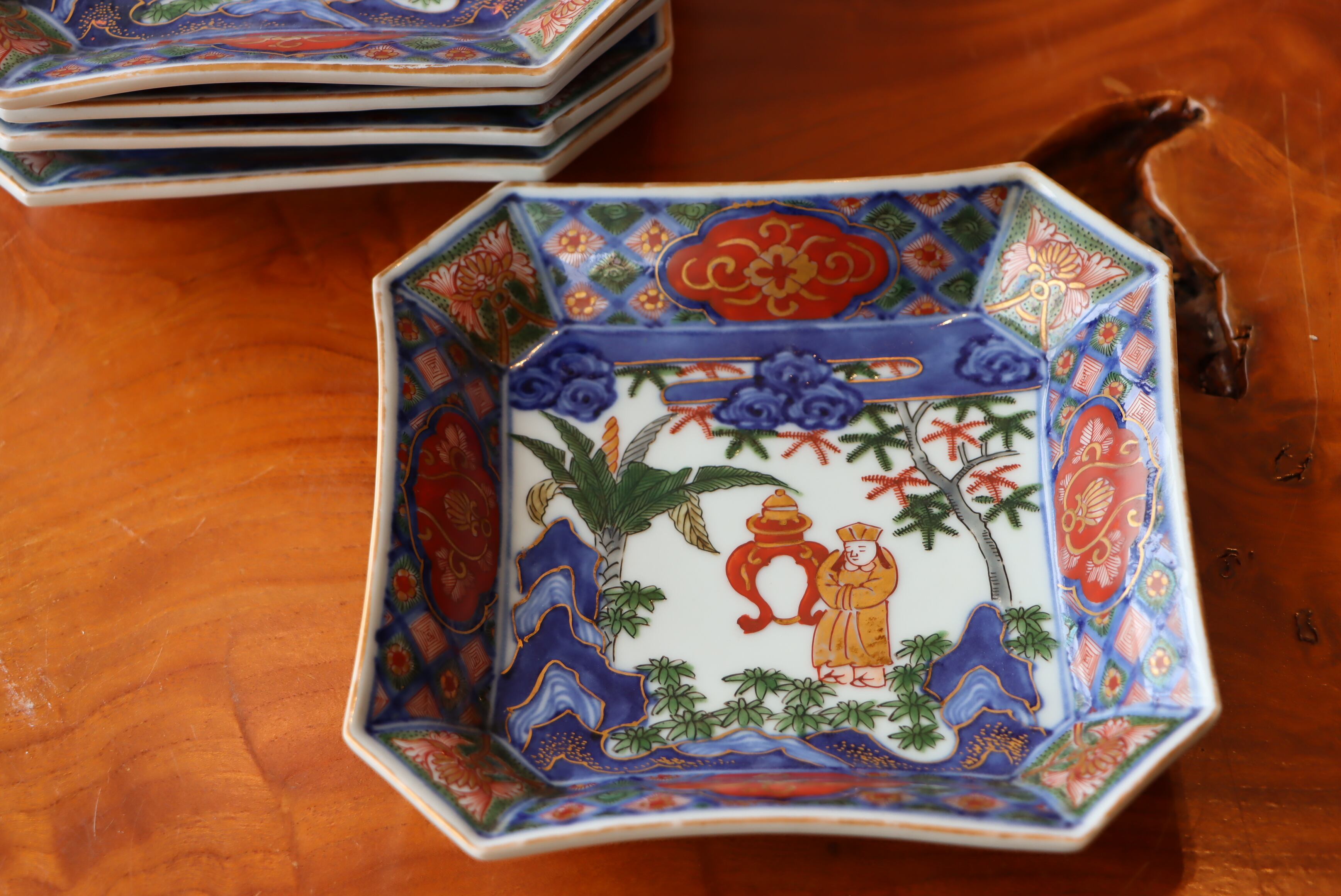 隅切四方皿 五枚組 大聖寺伊万里 色絵 人物風景文