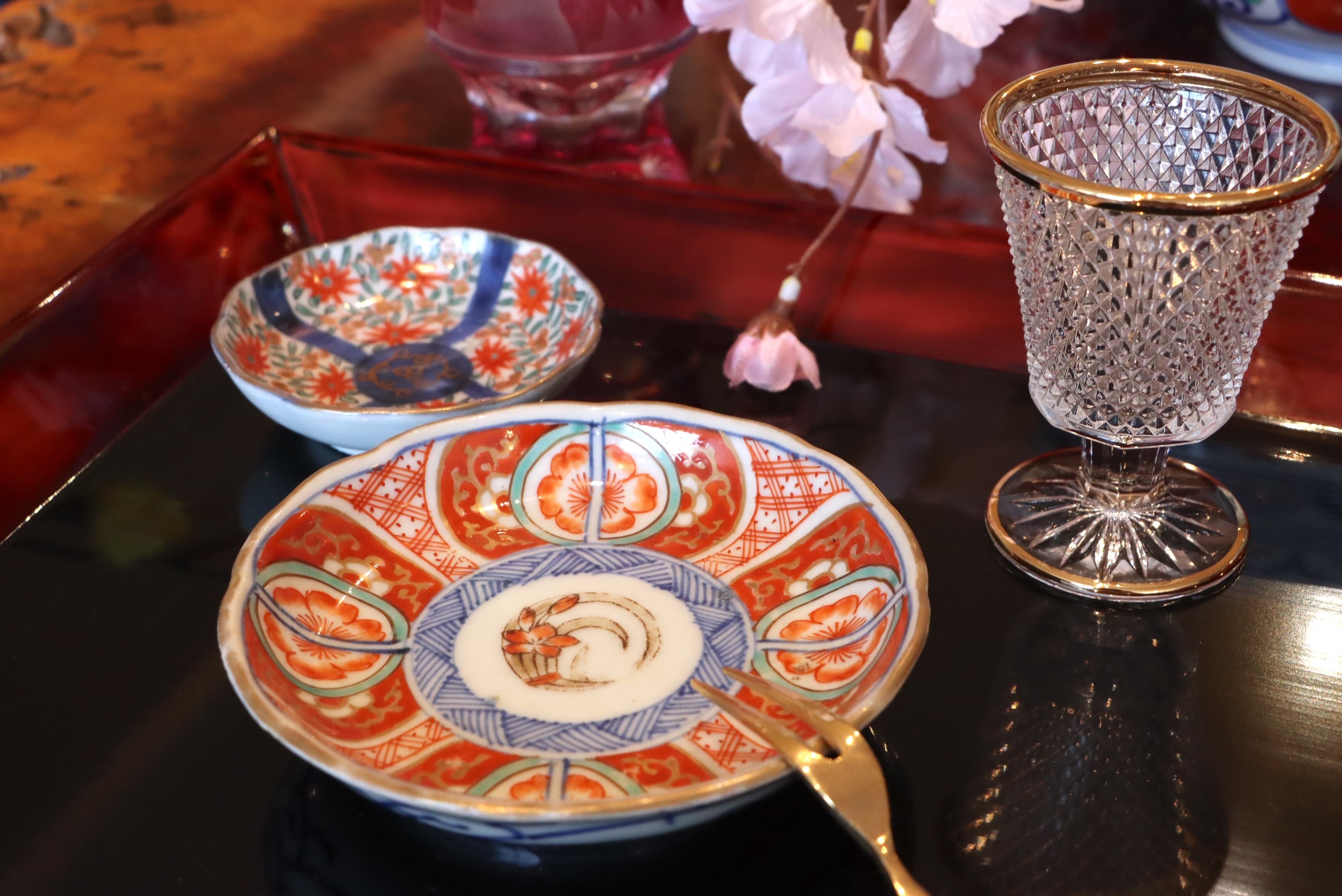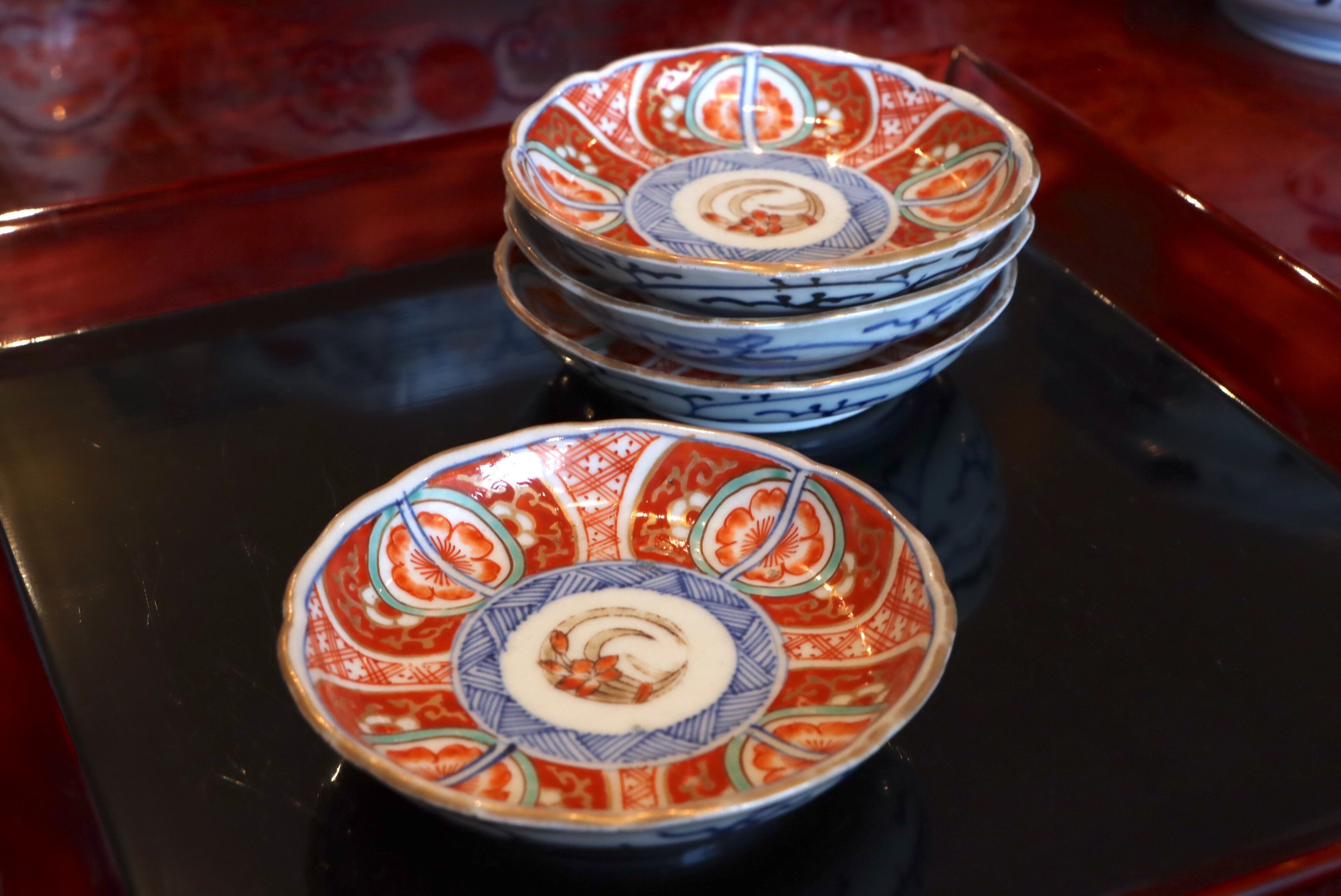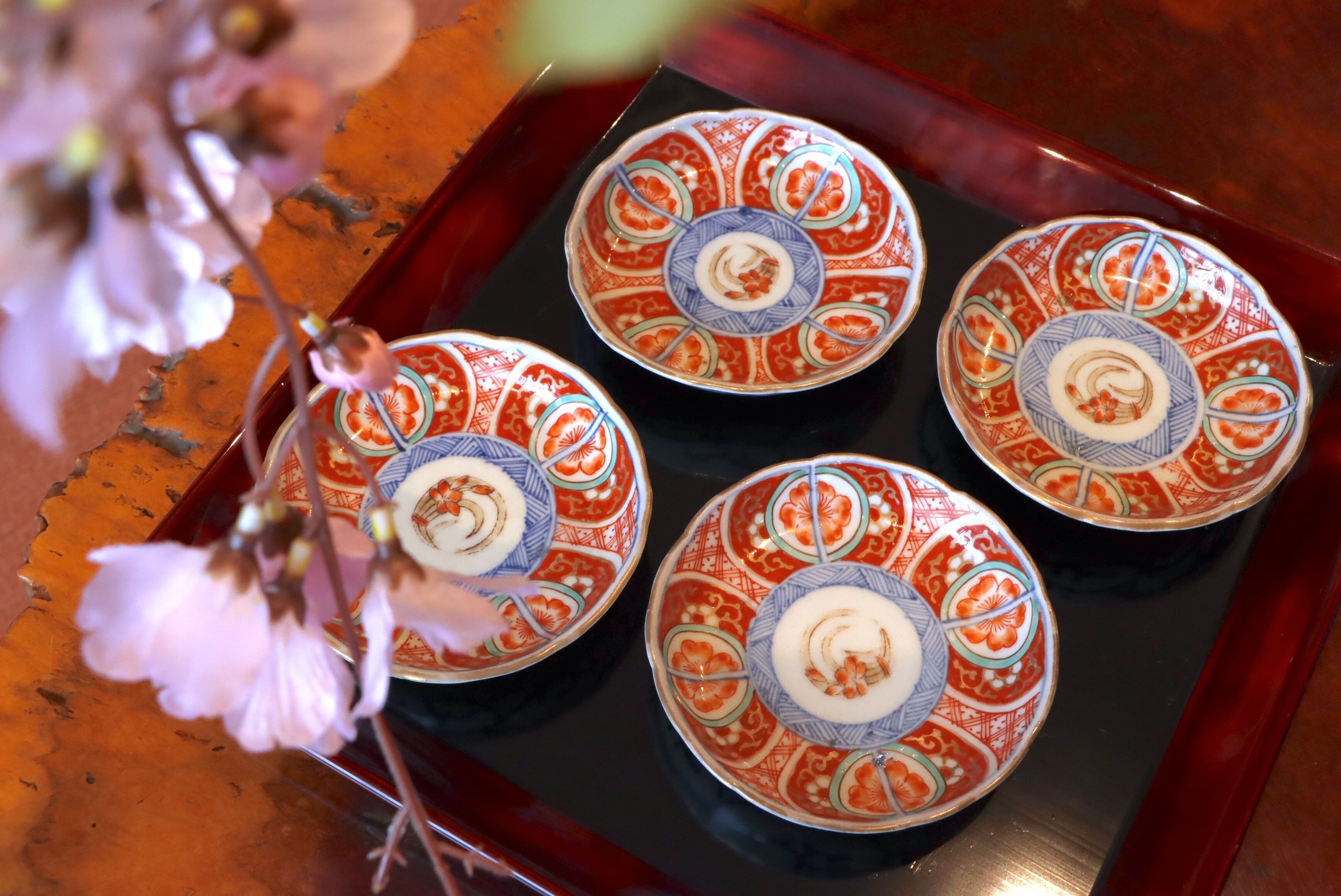 淡く色付けられた花文がふんわりと広がり、赤や藍のコントラストもどこか優しく、手に取るとほっとするような雰囲気です。