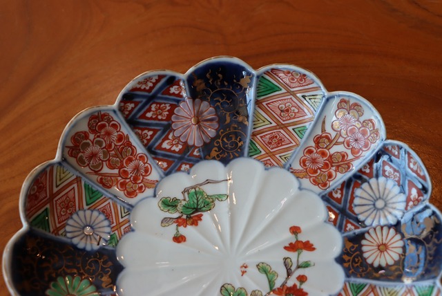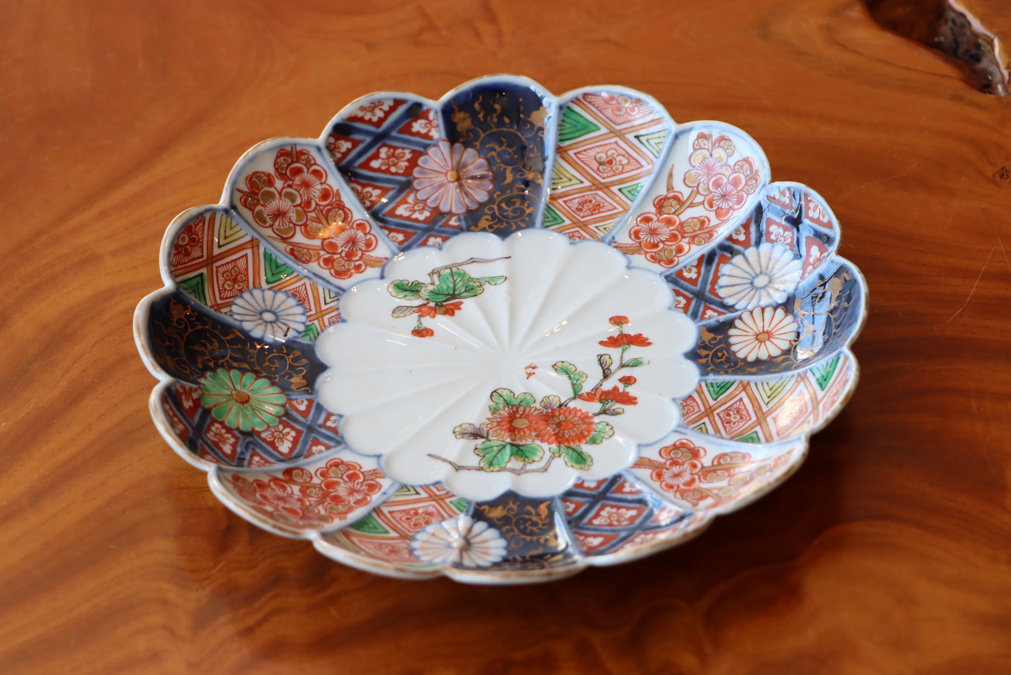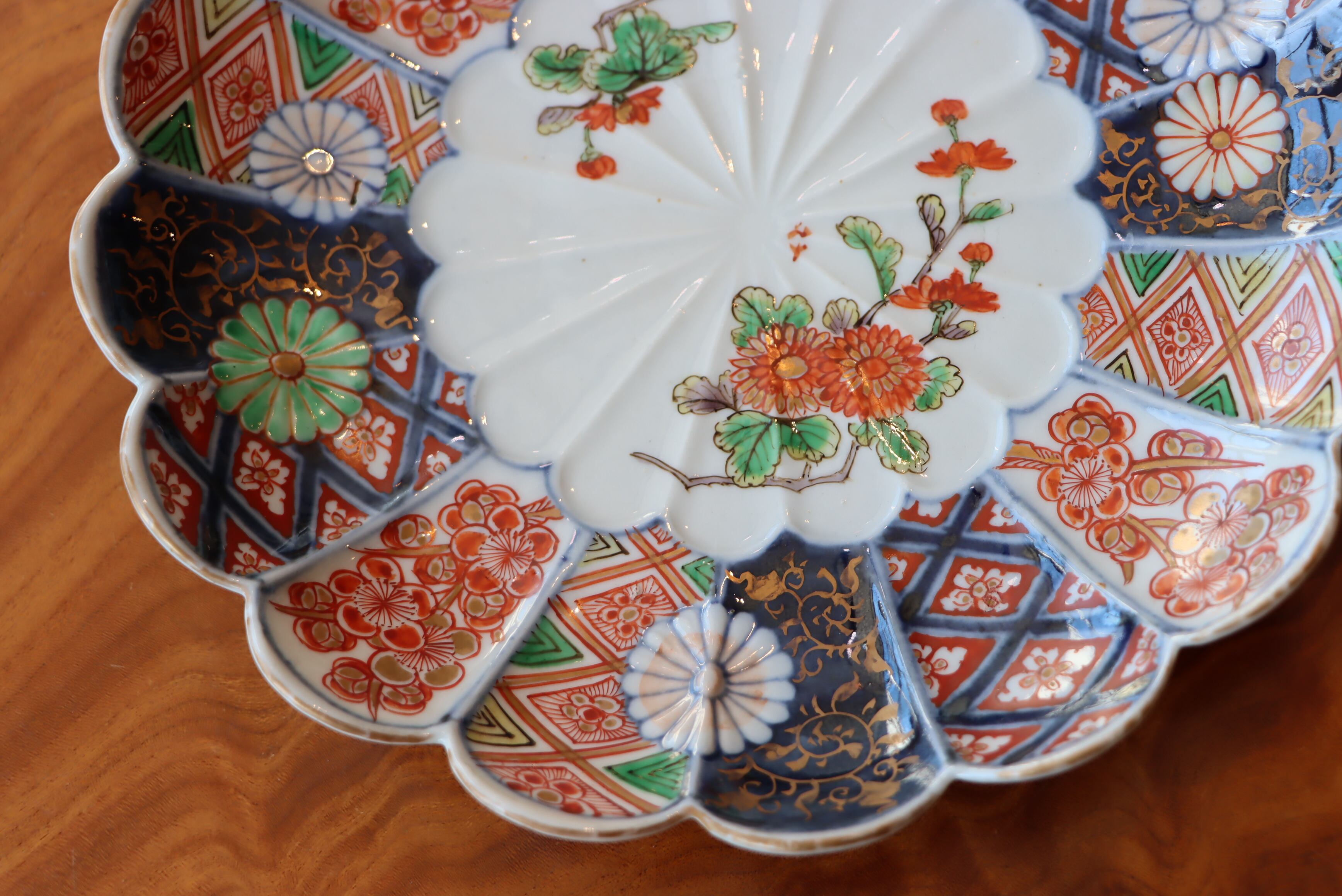 菊の花弁を模した構図が特徴で、花弁一枚一枚には幾何学模様や梅、菊模様などが描かれています✨見込みの空間が、周囲の複雑な模様と対比を成し、バランスの取れたデザインとなっています。