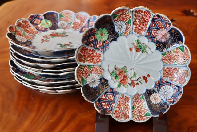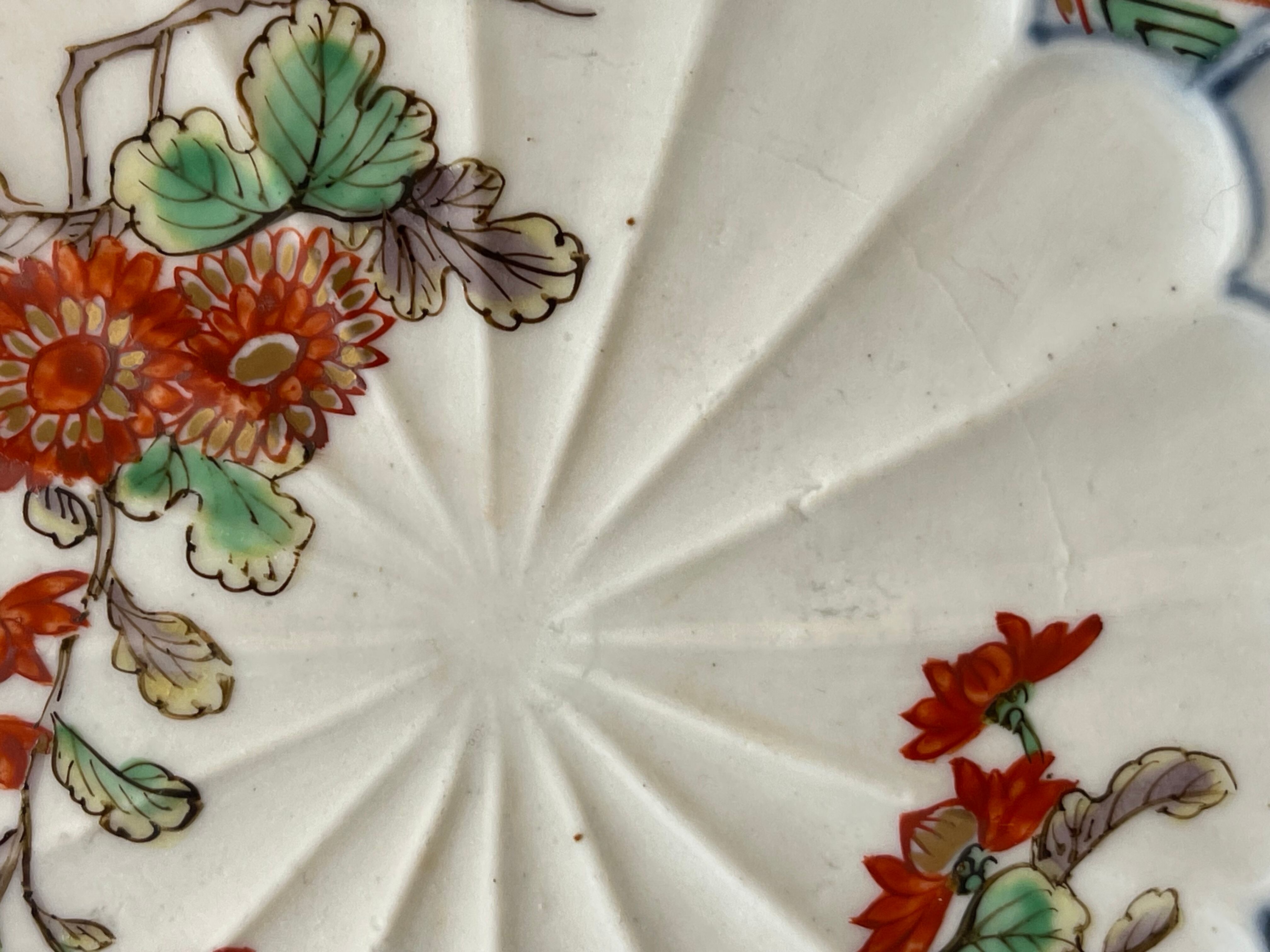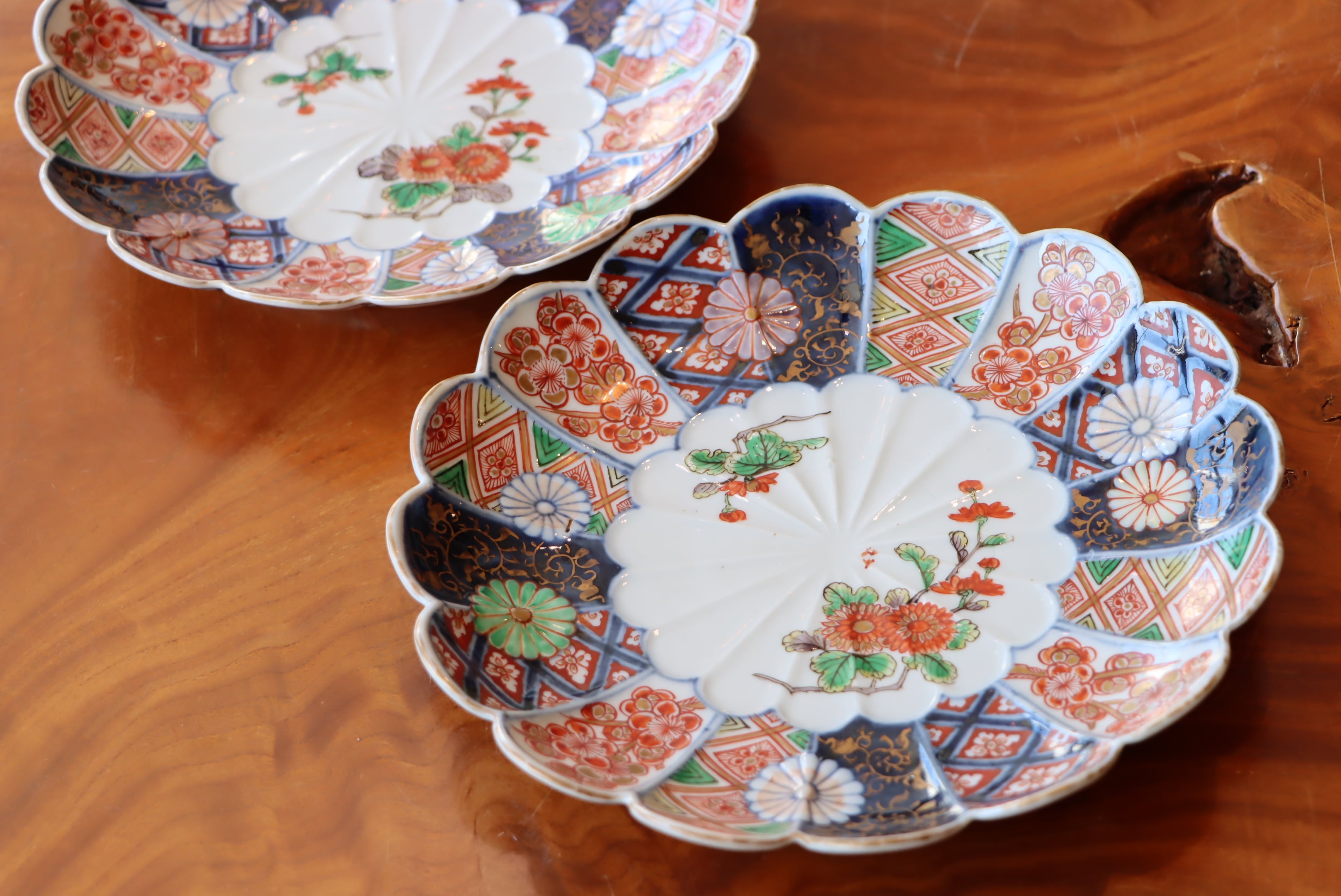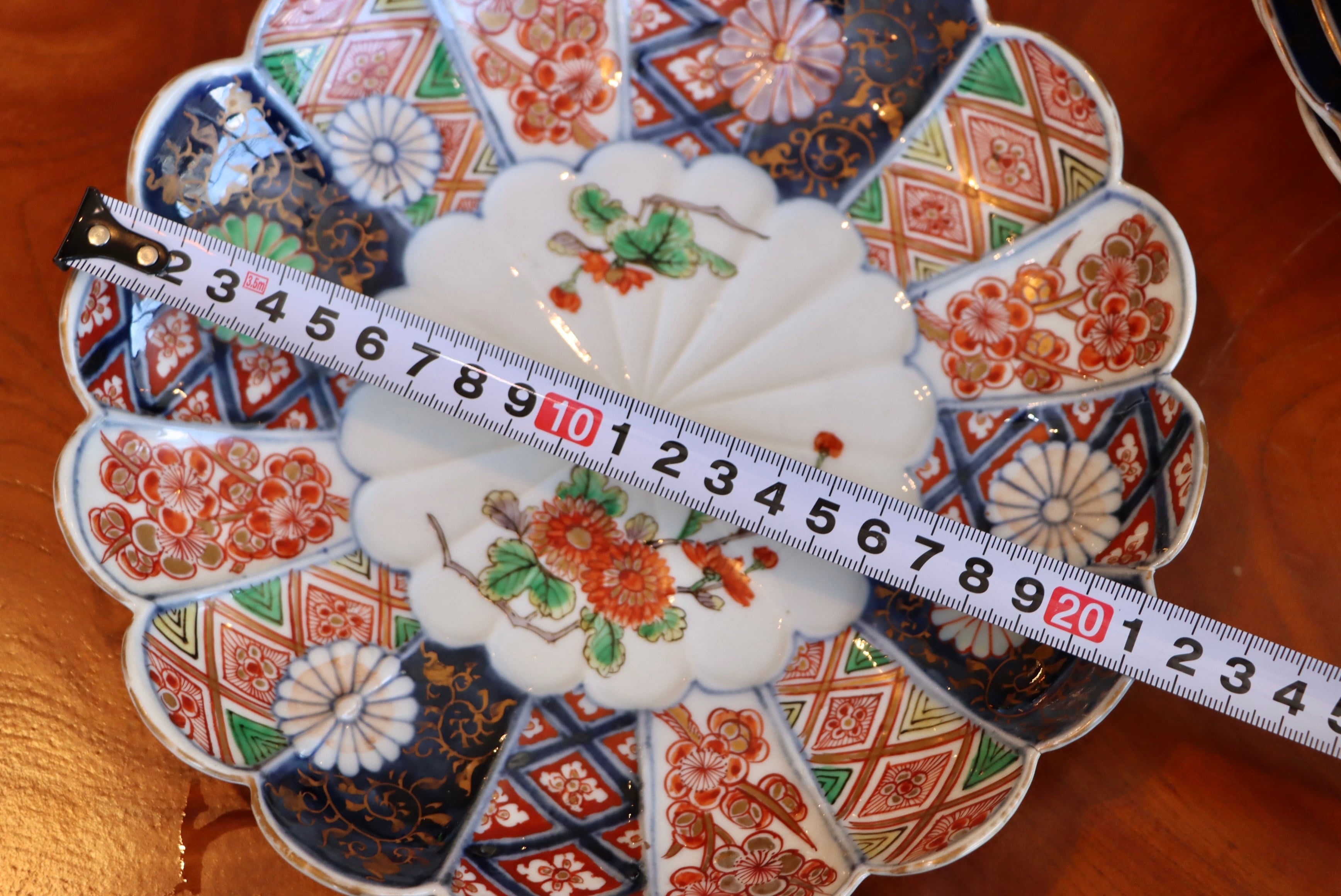 菊の花弁を模した構図が特徴で、花弁一枚一枚には幾何学模様や梅、菊模様などが描かれています✨見込みの空間が、周囲の複雑な模様と対比を成し、バランスの取れたデザインとなっています。