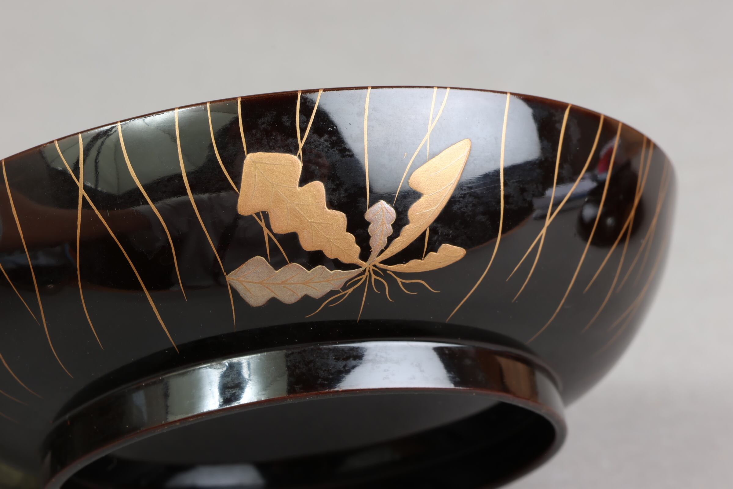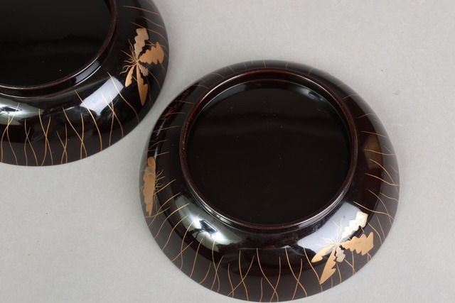 漆の黒地に金、銀蒔絵で大根と蕪が施されており