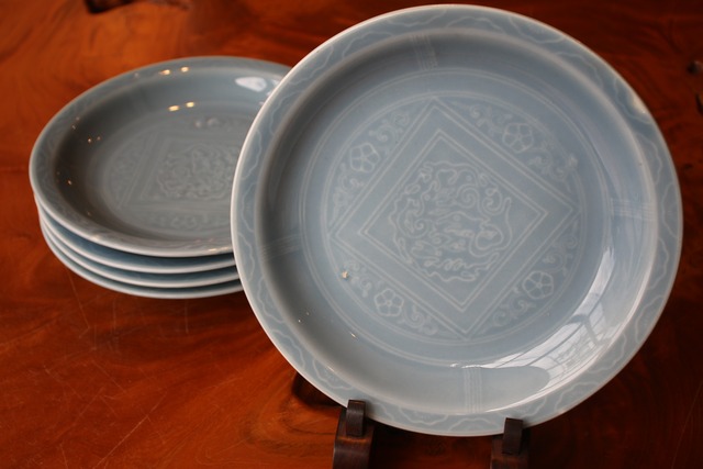 青磁 龍唐草文 中皿 七寸 五枚組 C