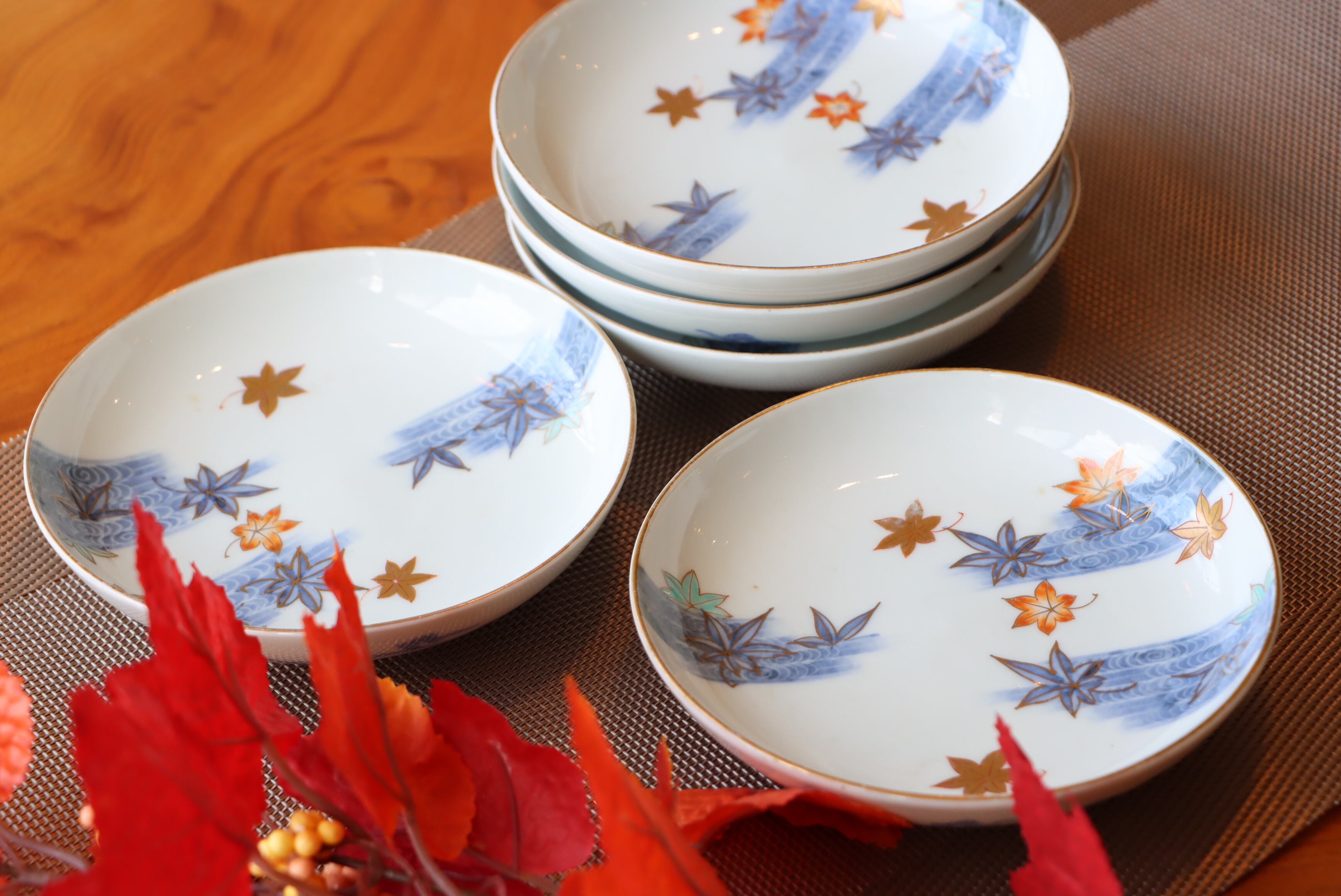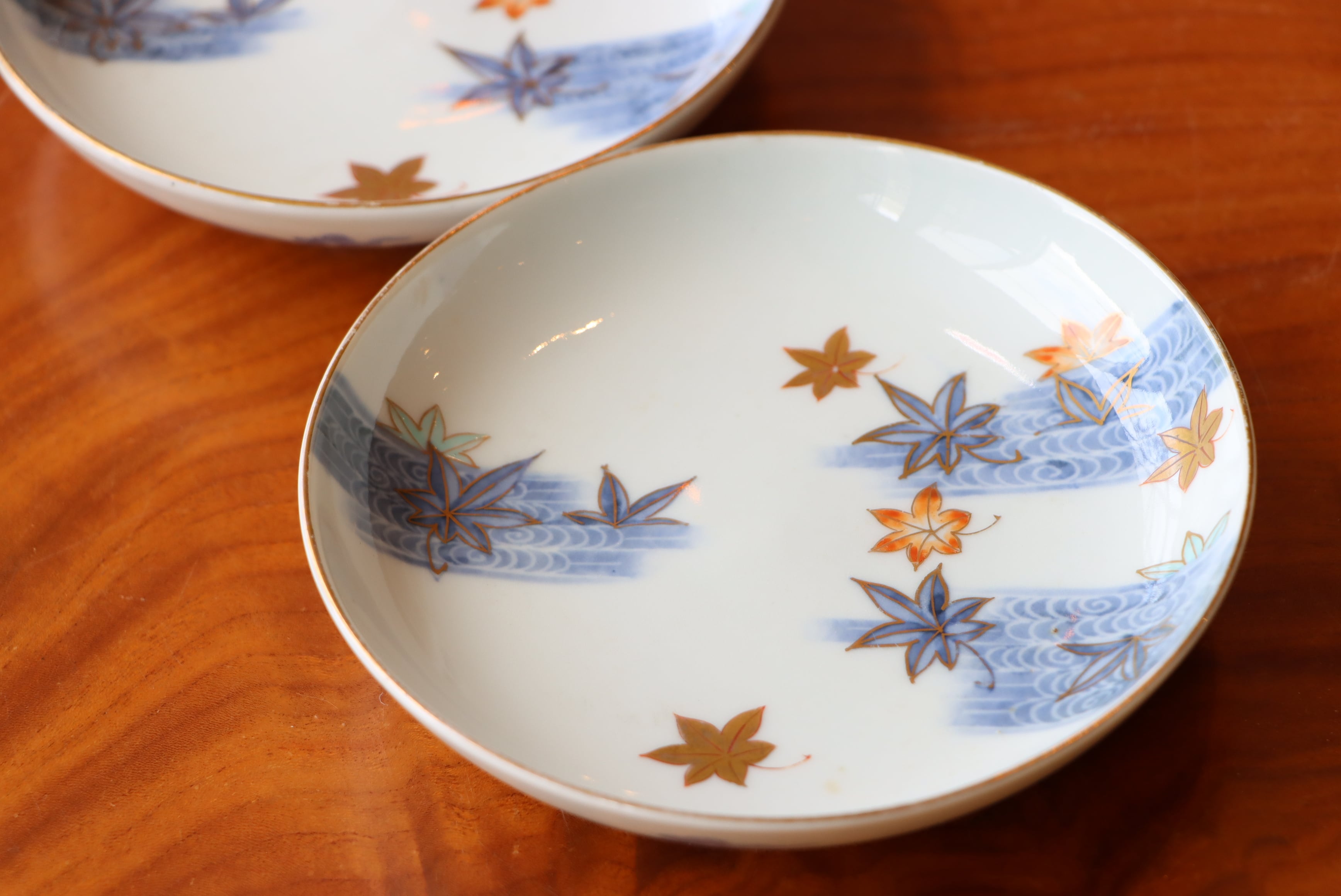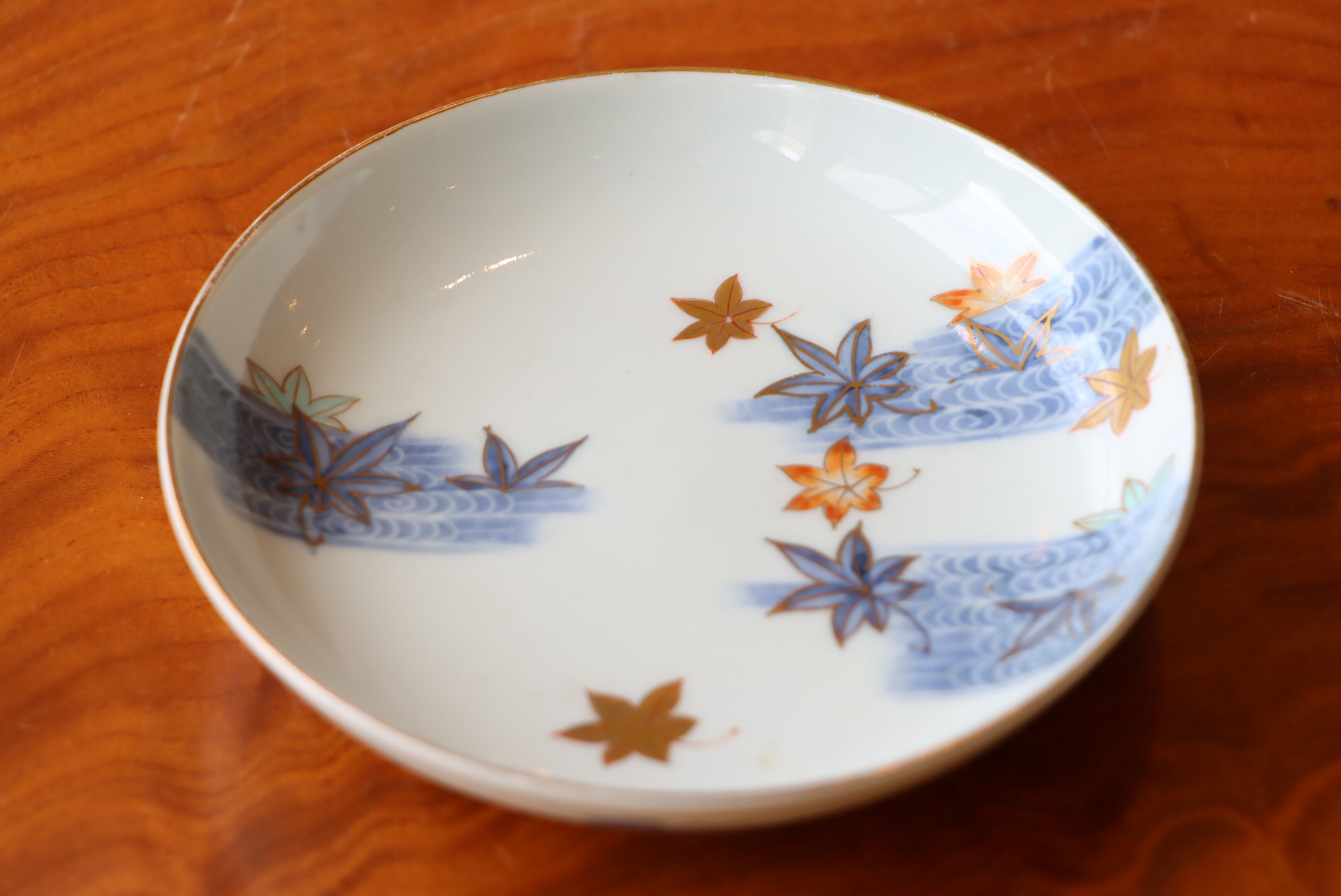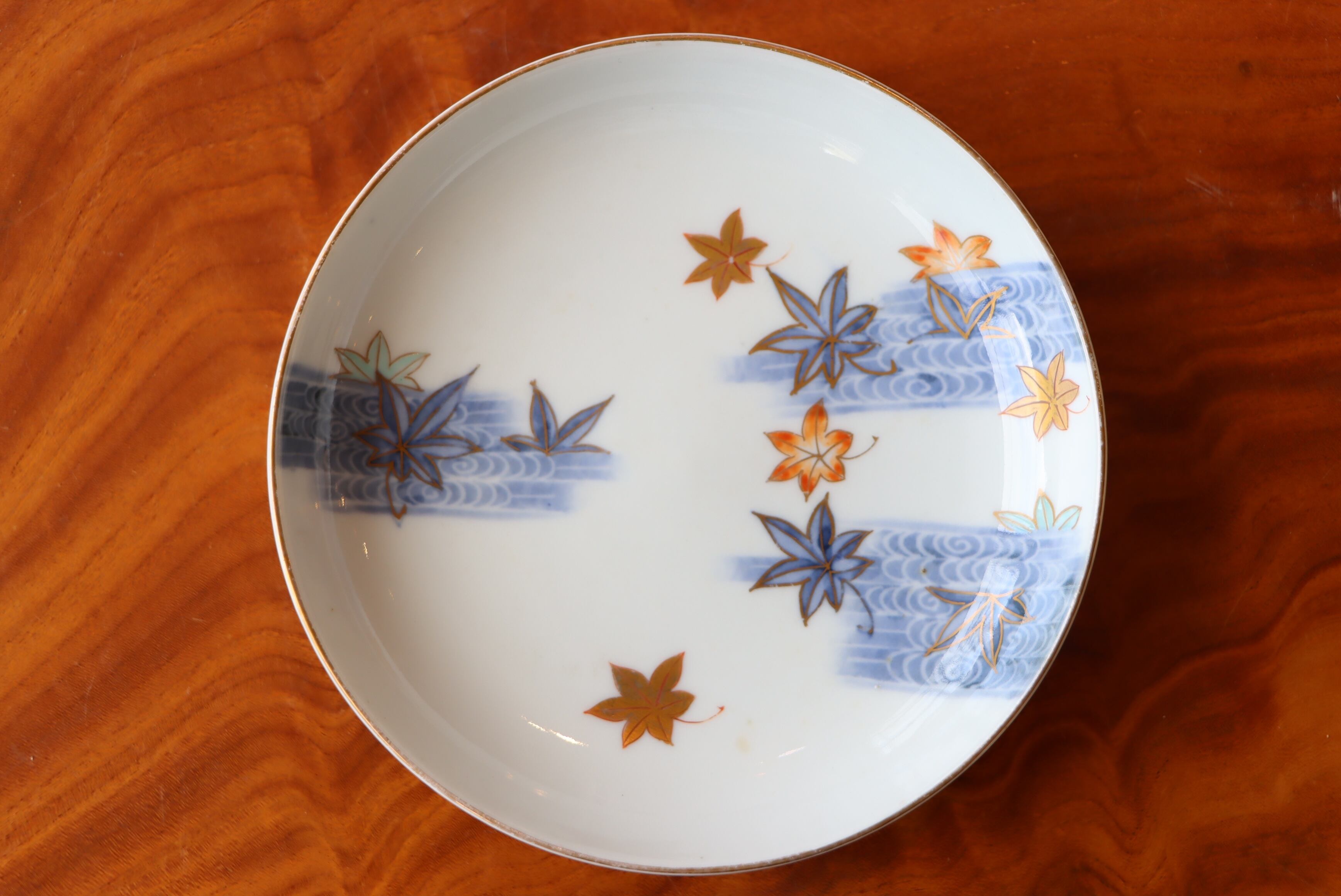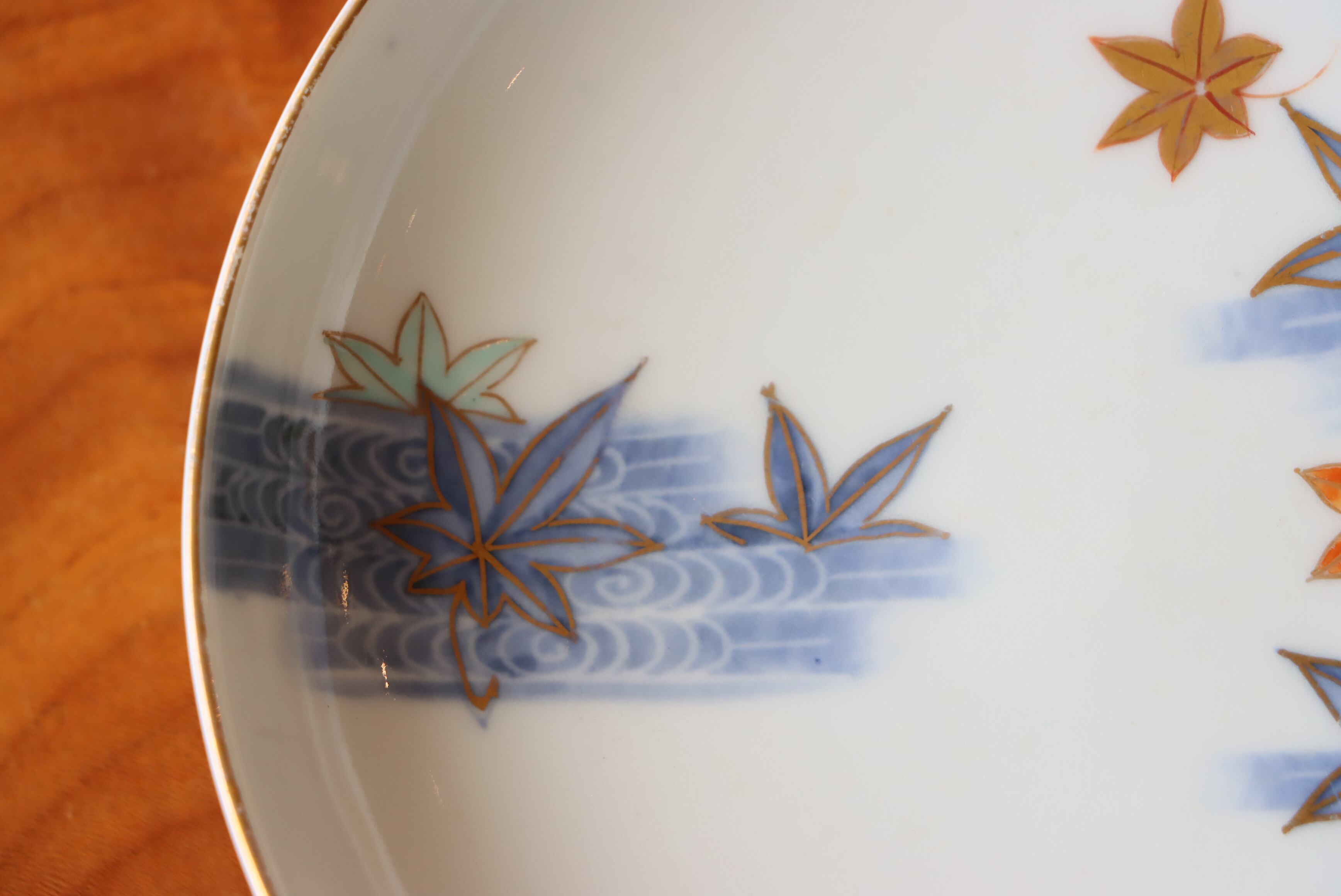 【Imari small dish with maple leaves and the flow of the river design in overglaze enamels.】