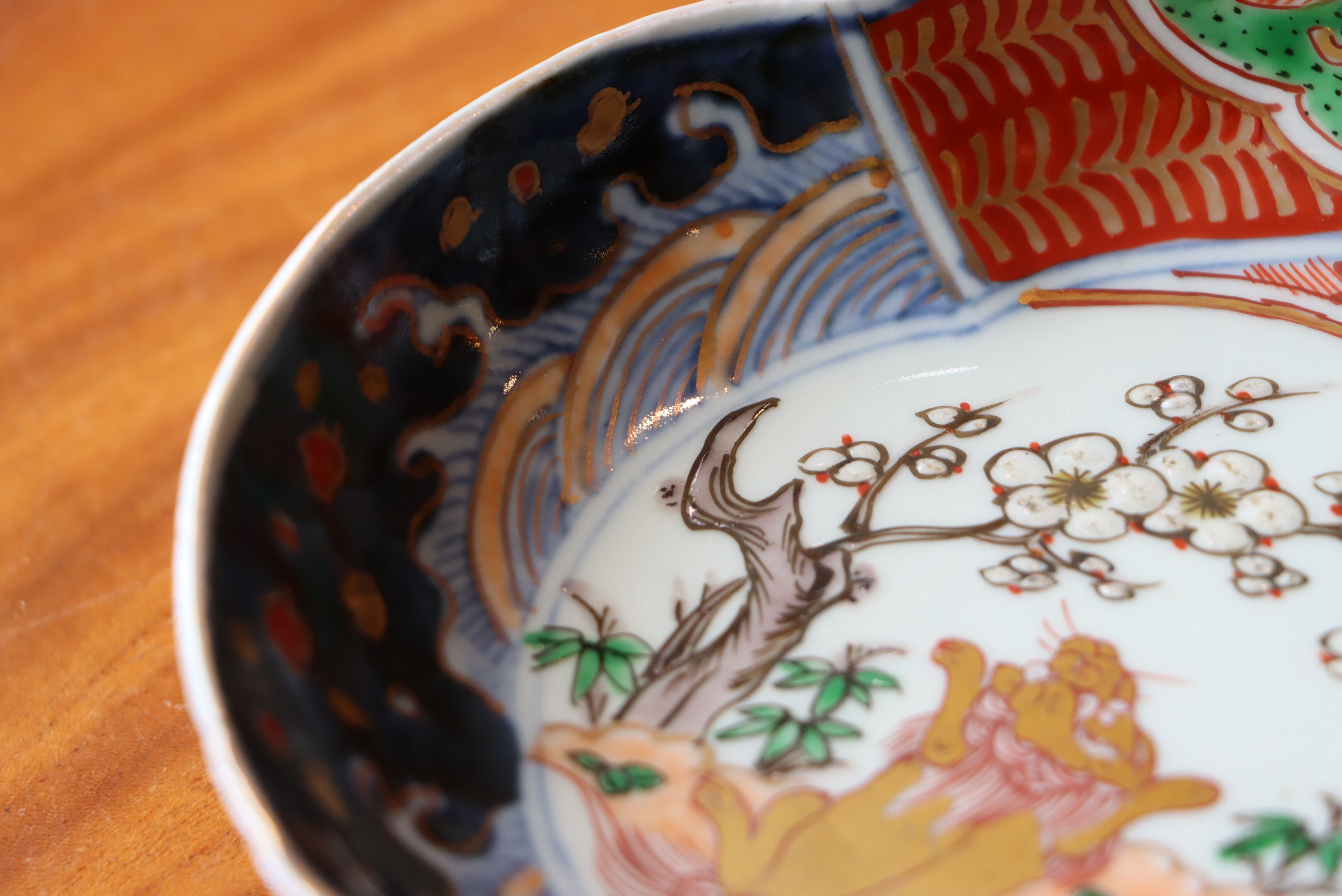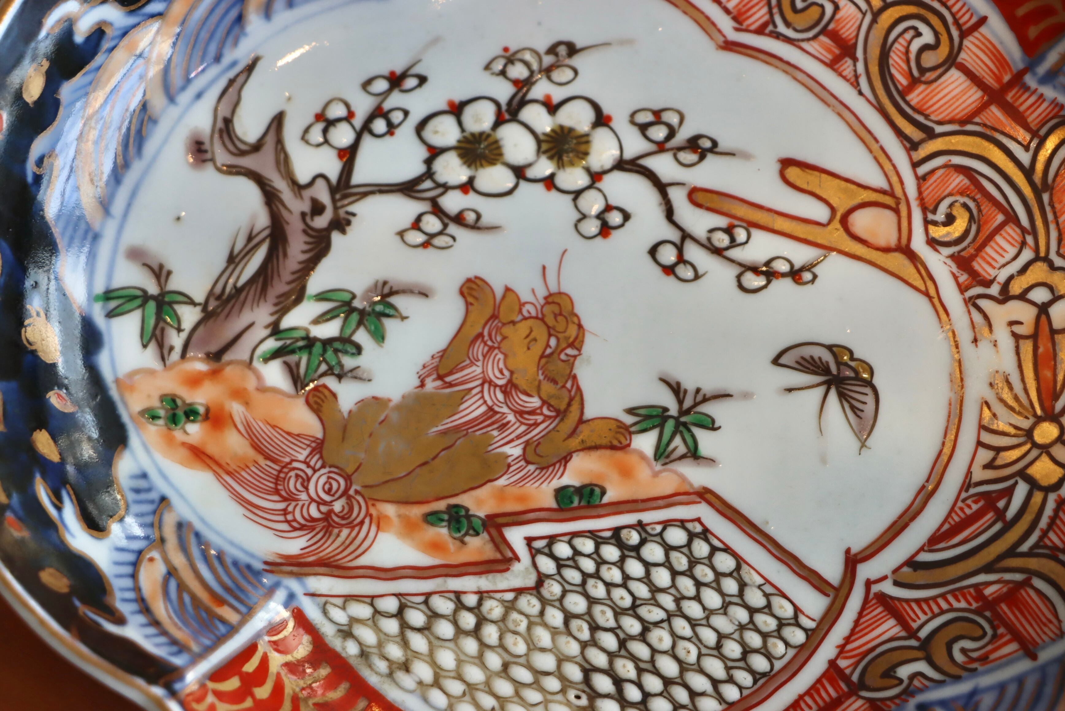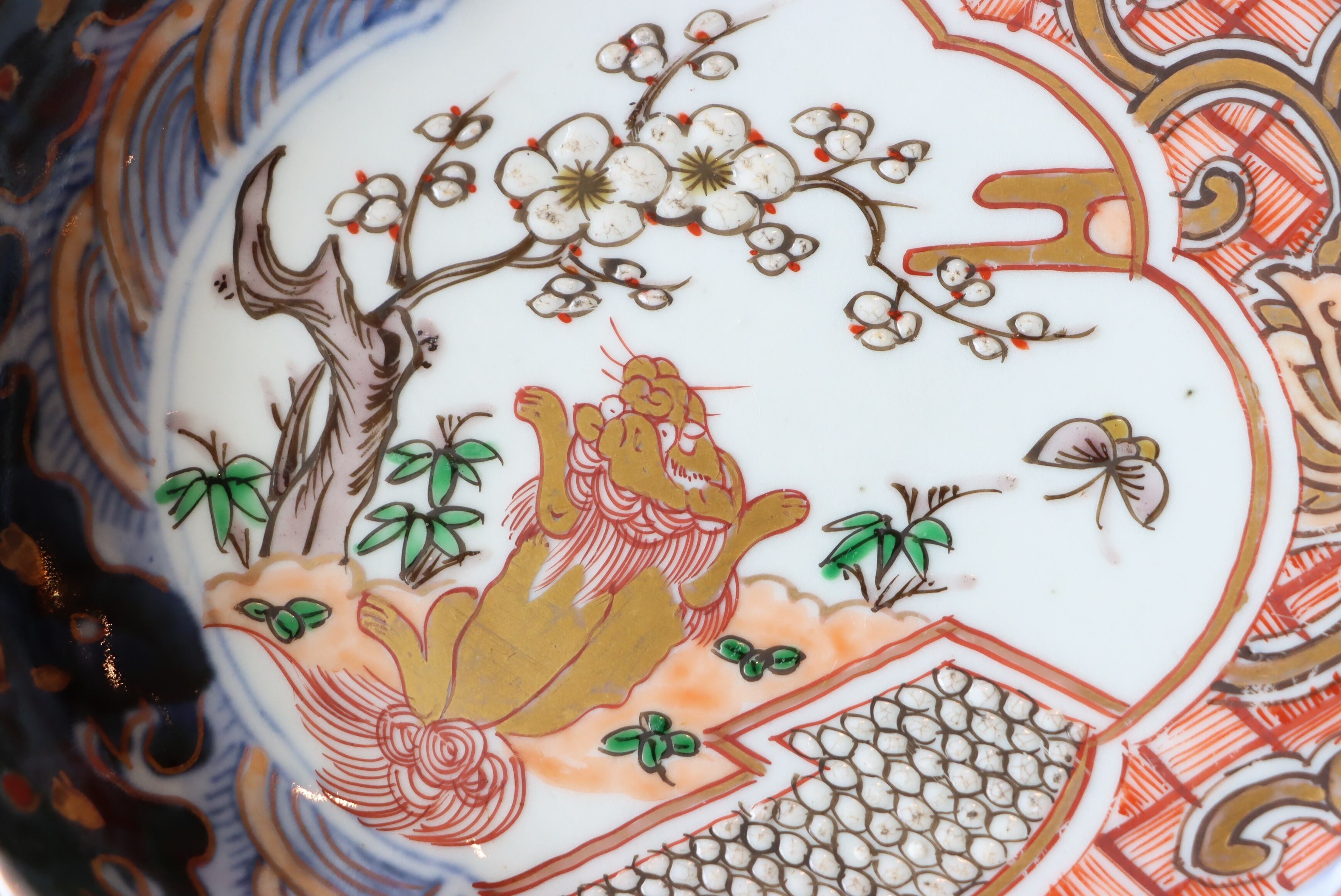 [Imari plate with lion, flower and butterfly design in overglaze enamels.]