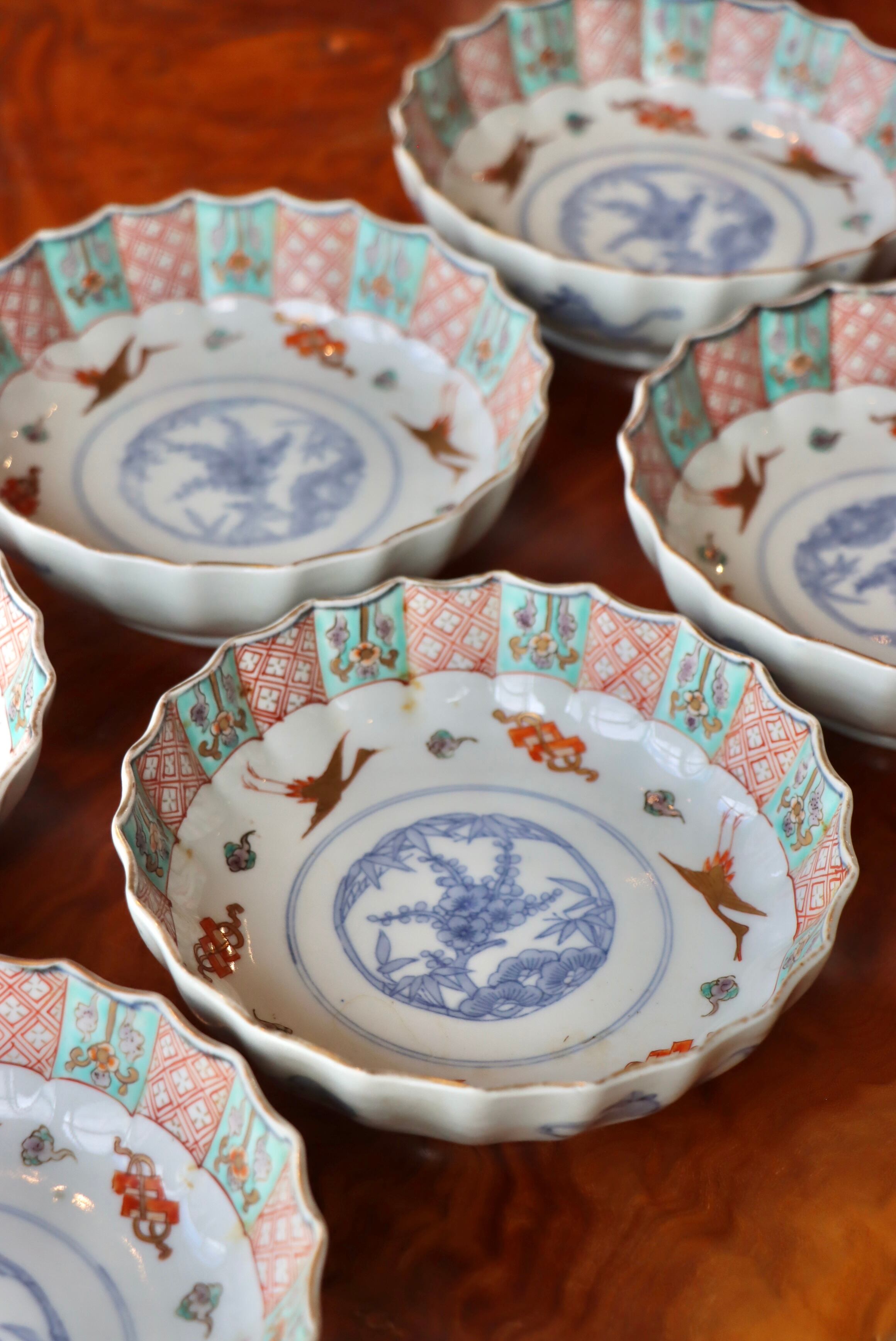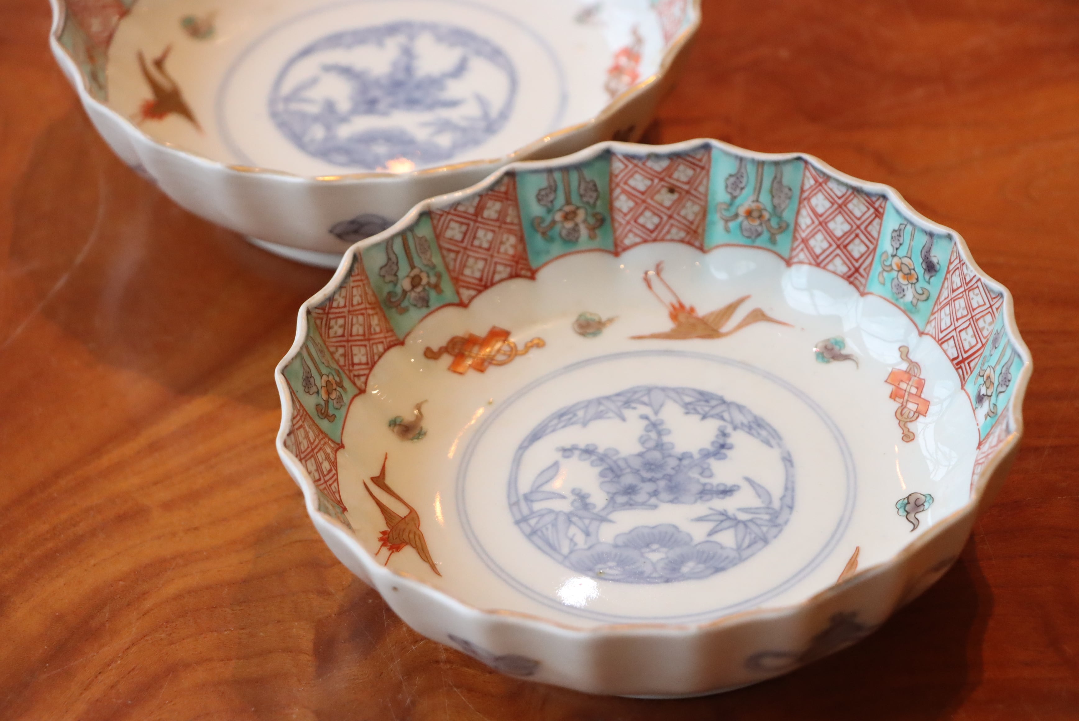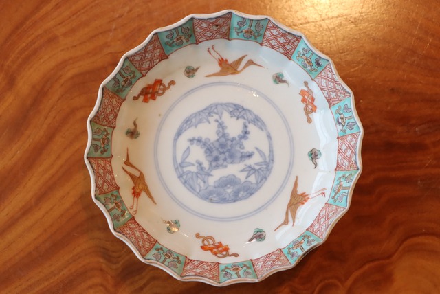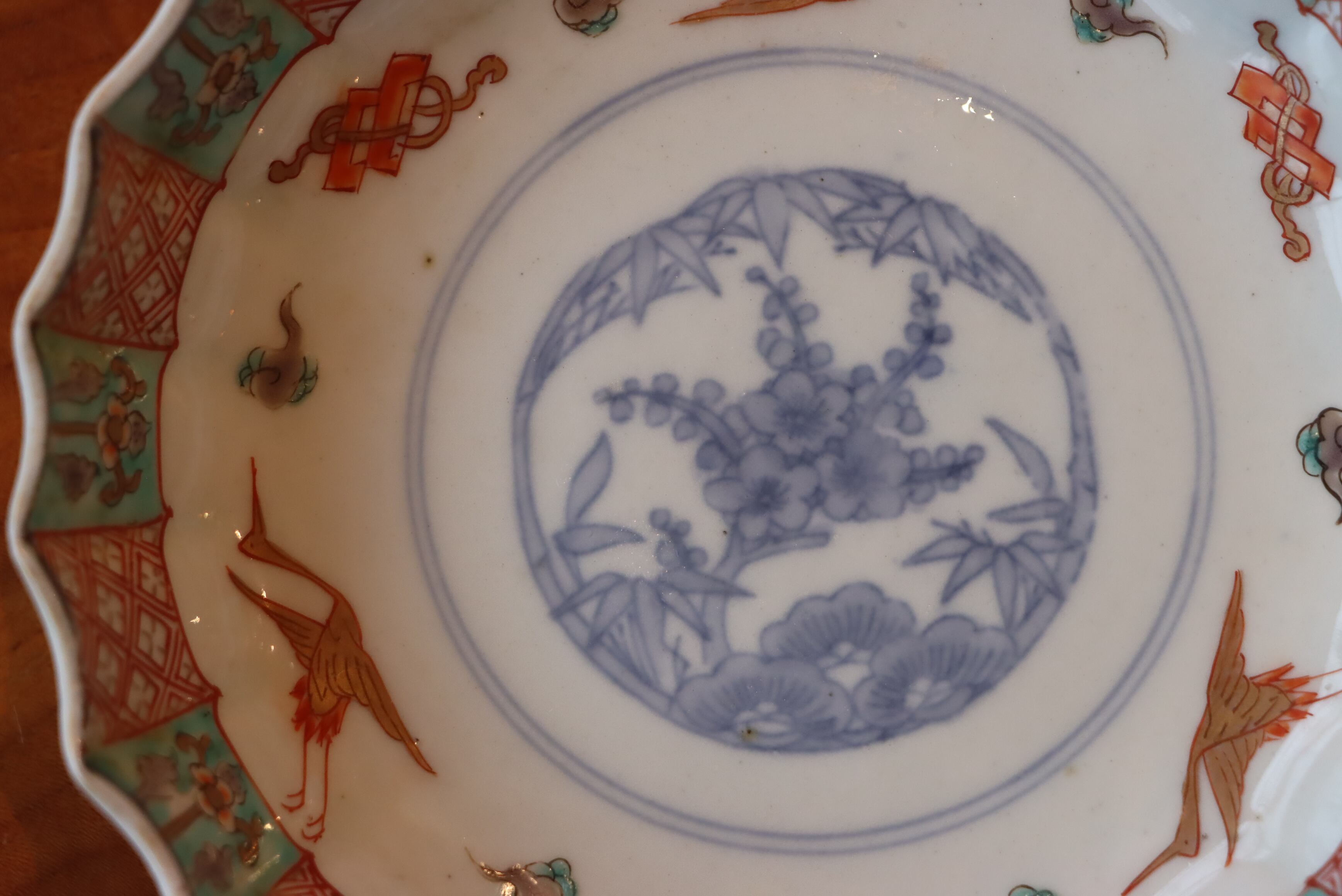 伊万里焼 色絵 松竹梅鶴文 膾皿/Imari lobed bowl