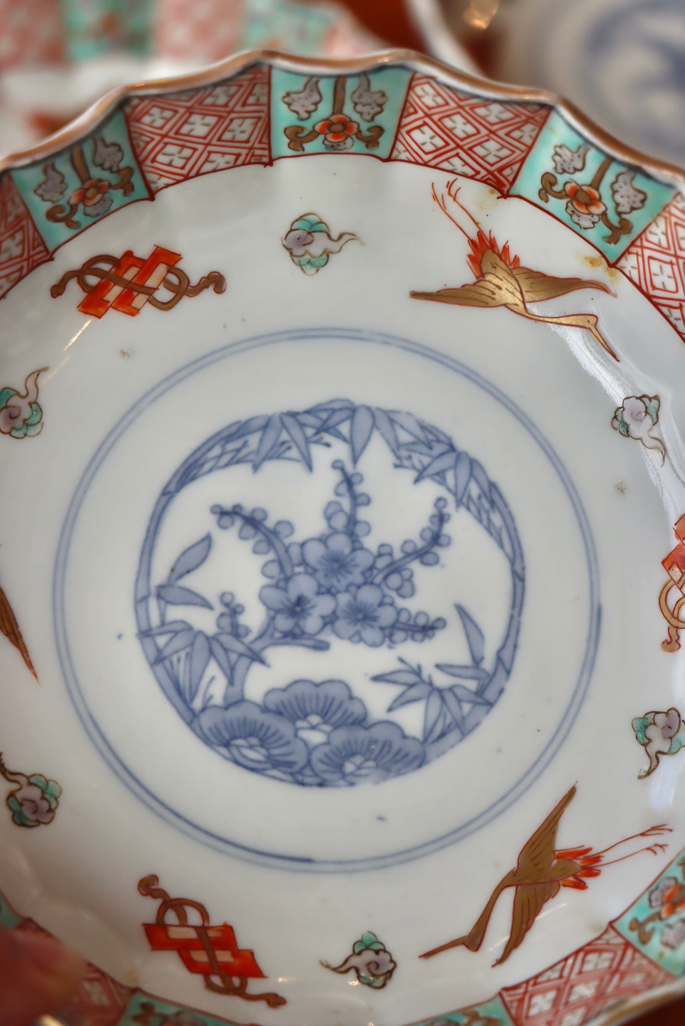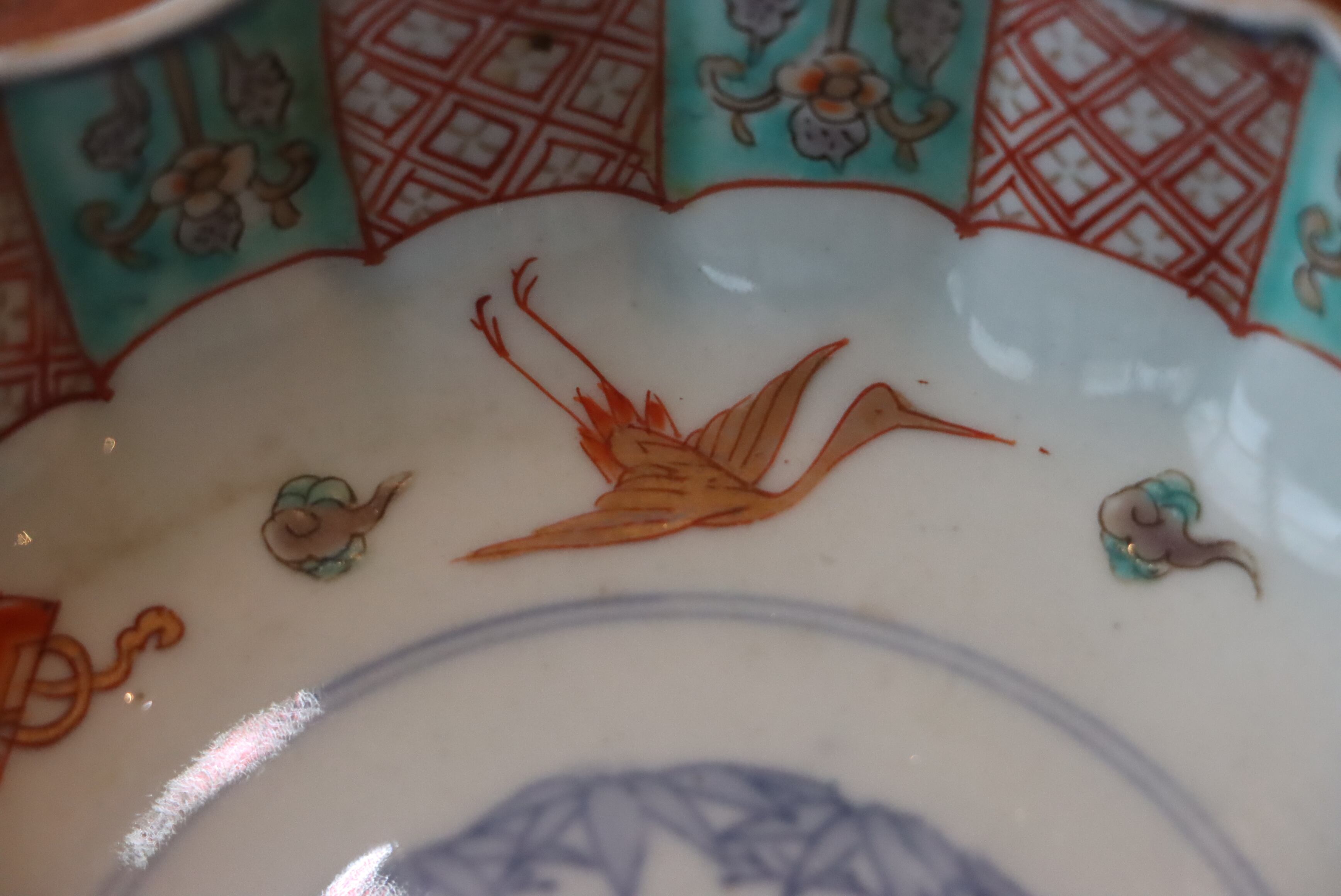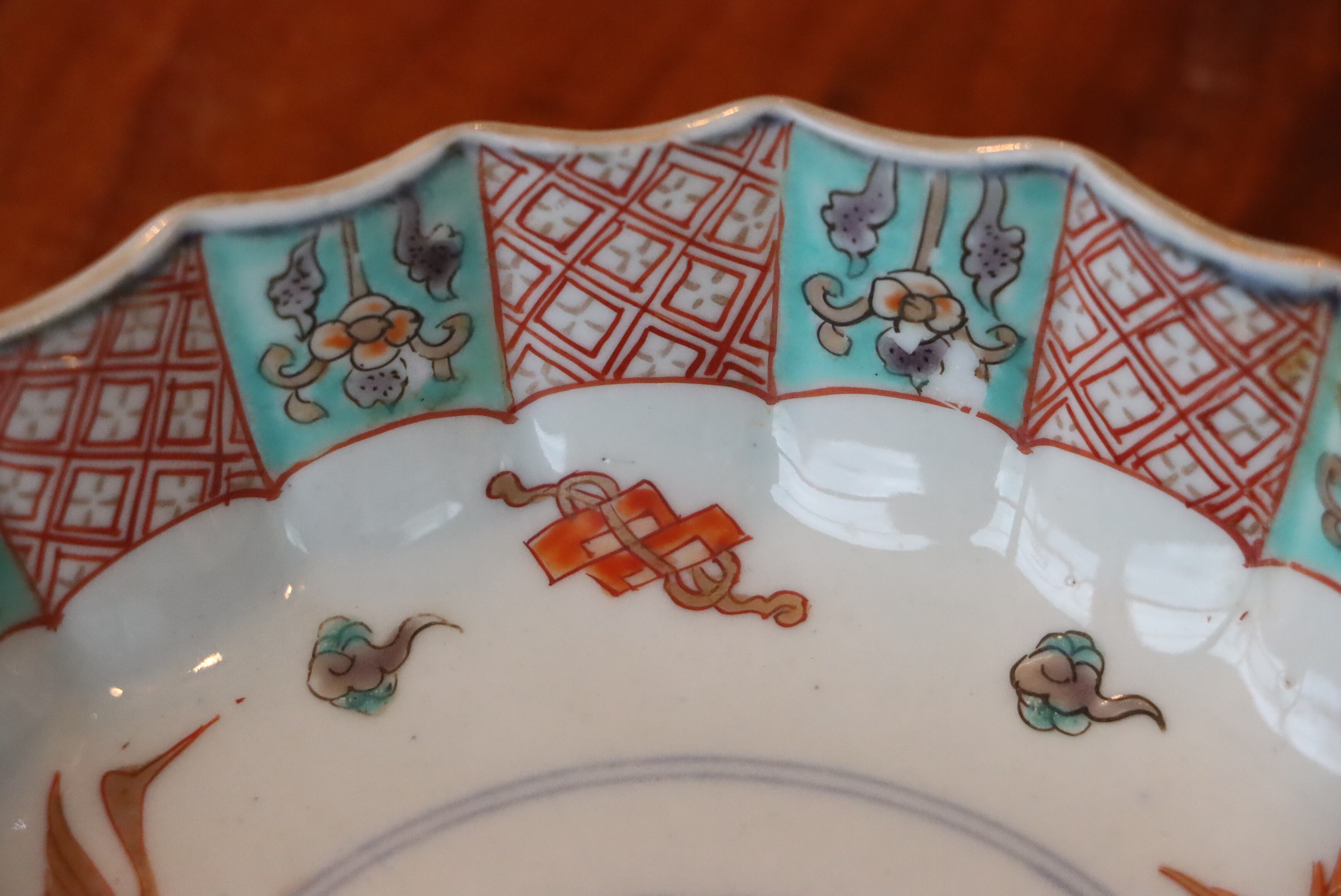 【Imari lobed bowl with cranes and clouds design in overglaze enamels.】