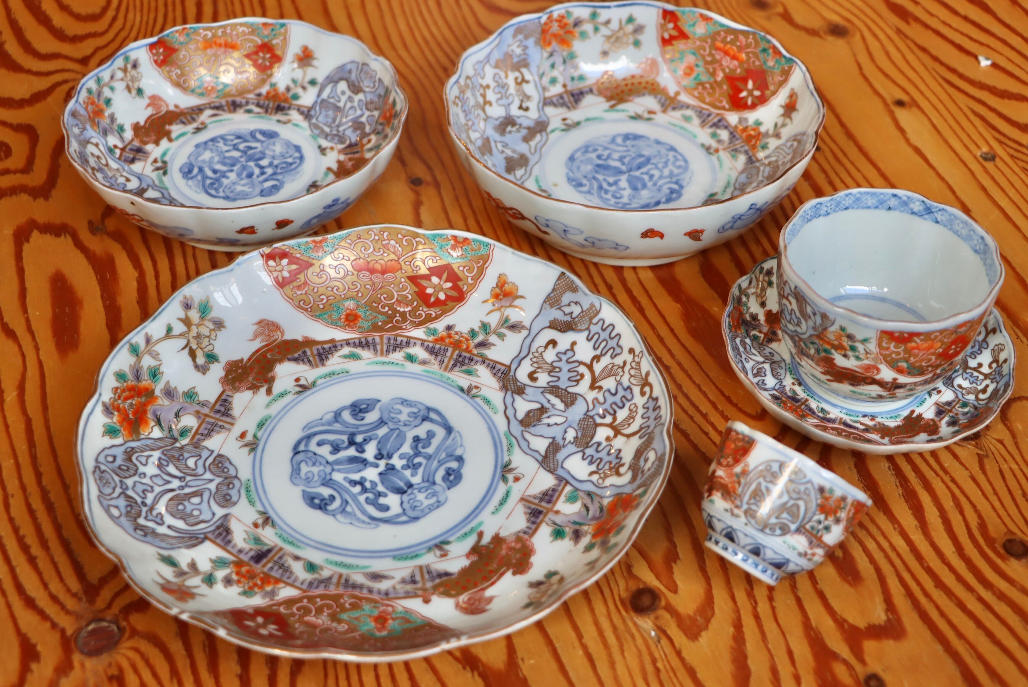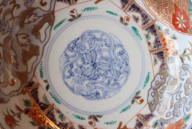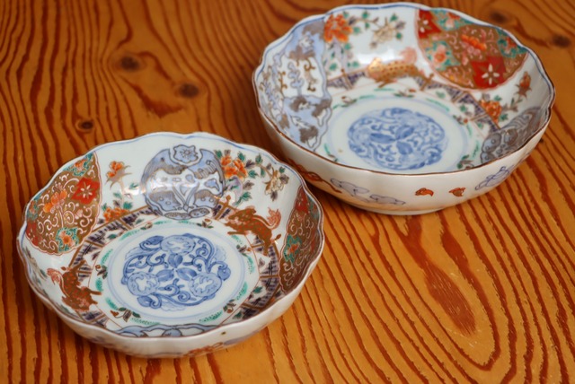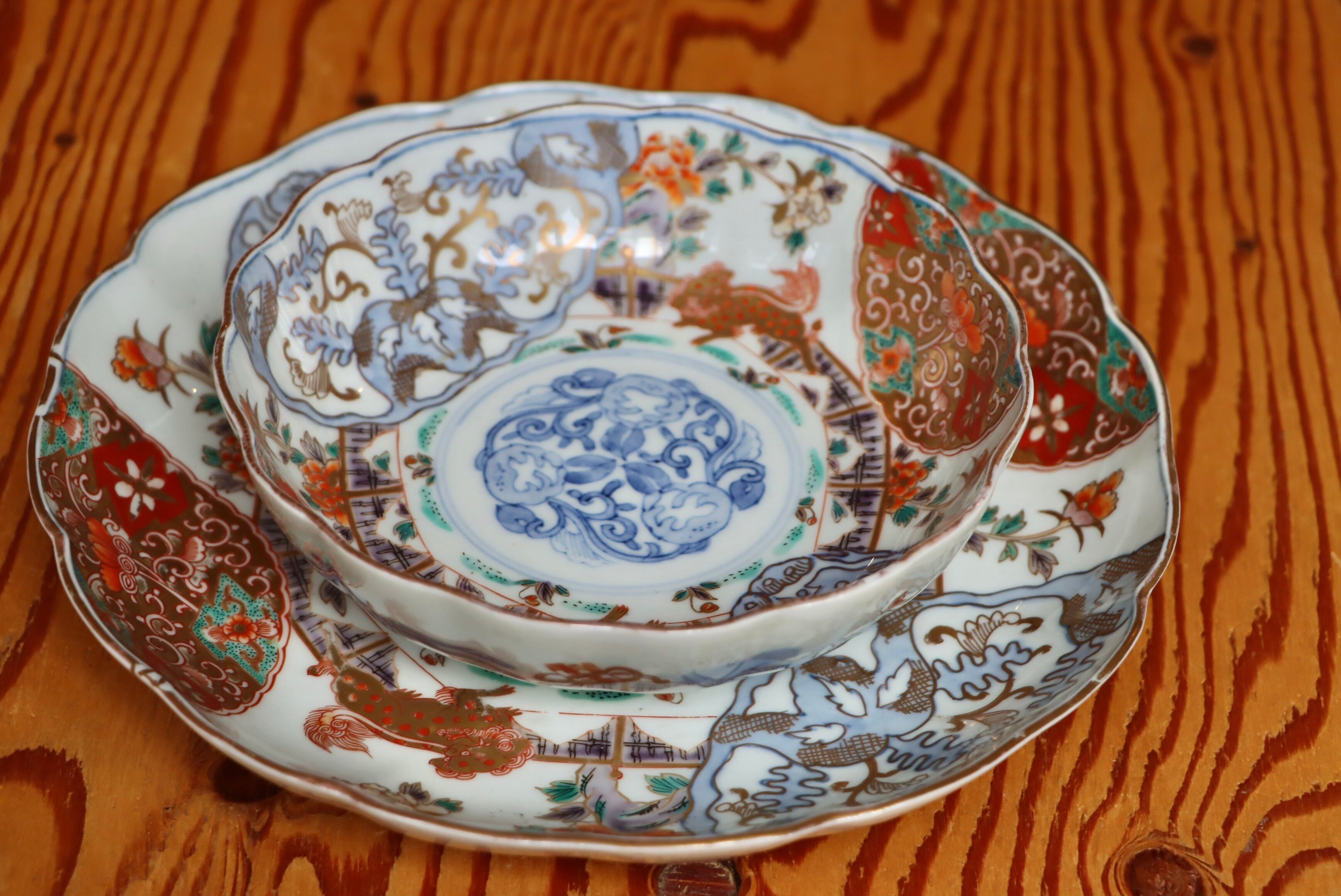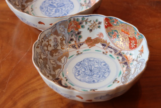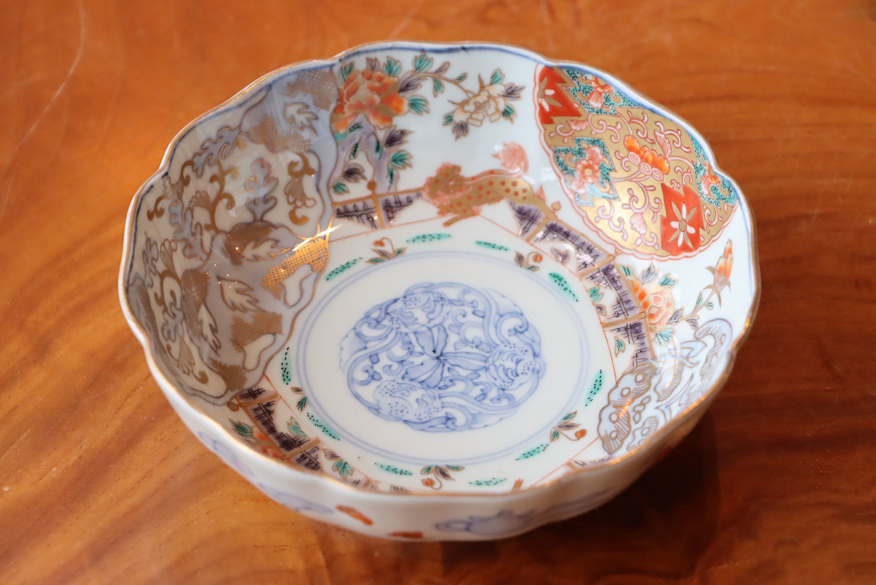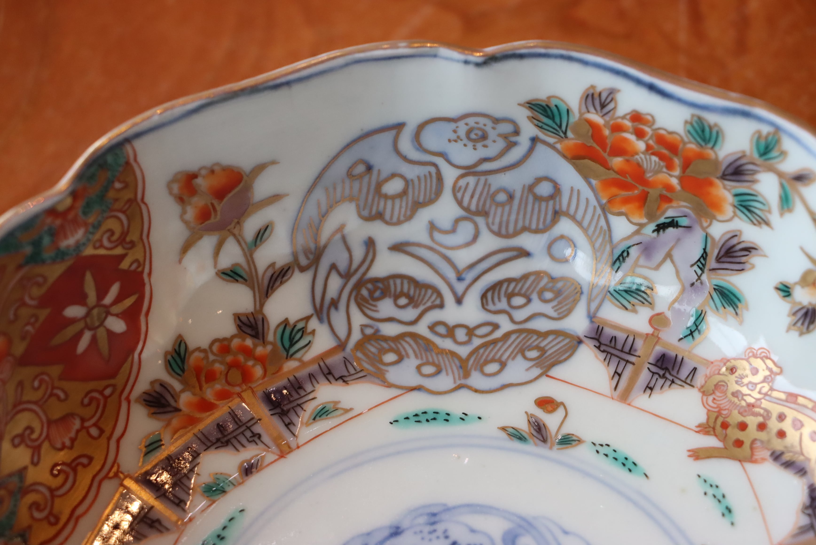 伊万里焼 色絵 唐獅子牡丹文 膾皿 大 通りもの/Imari lobed bowl