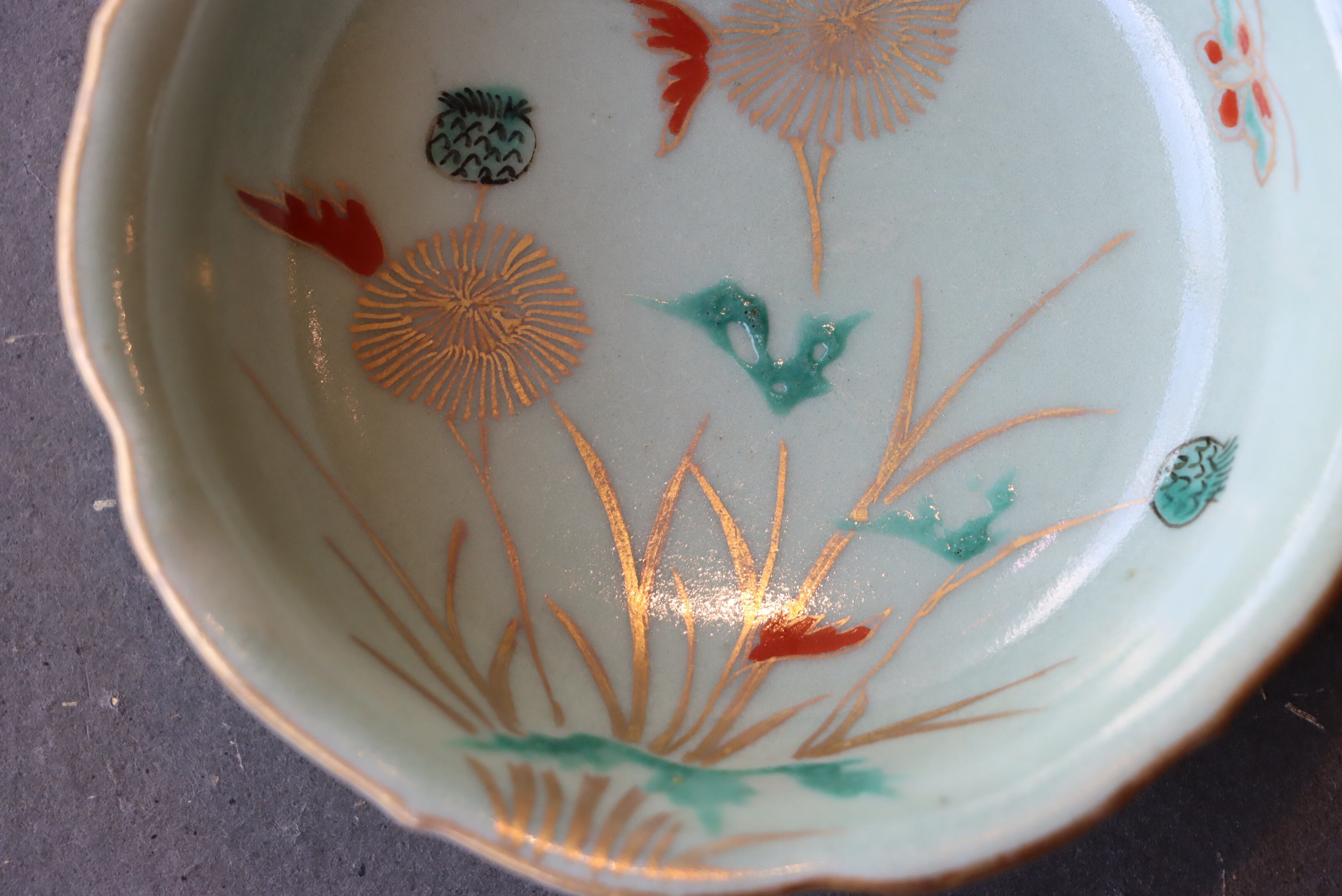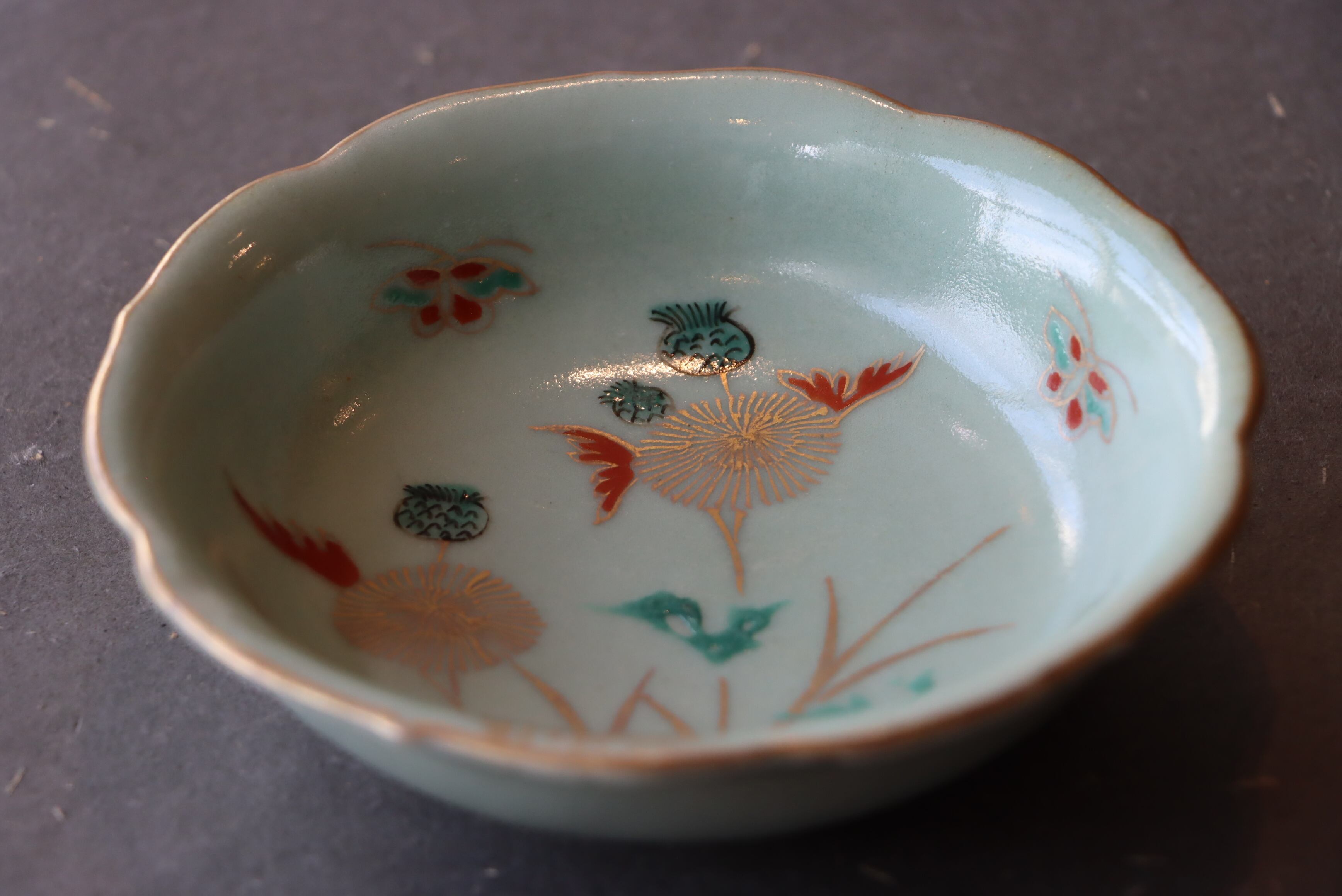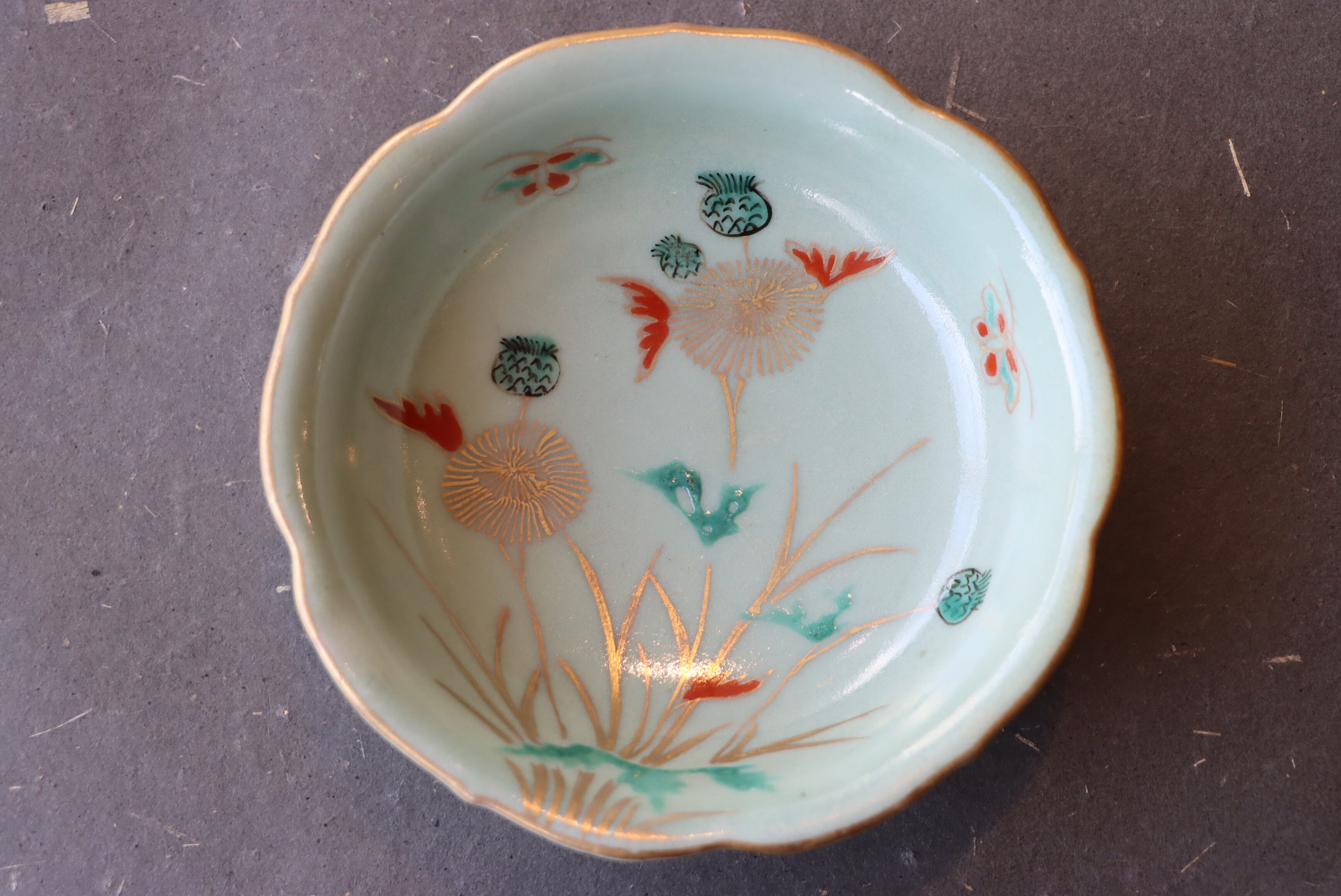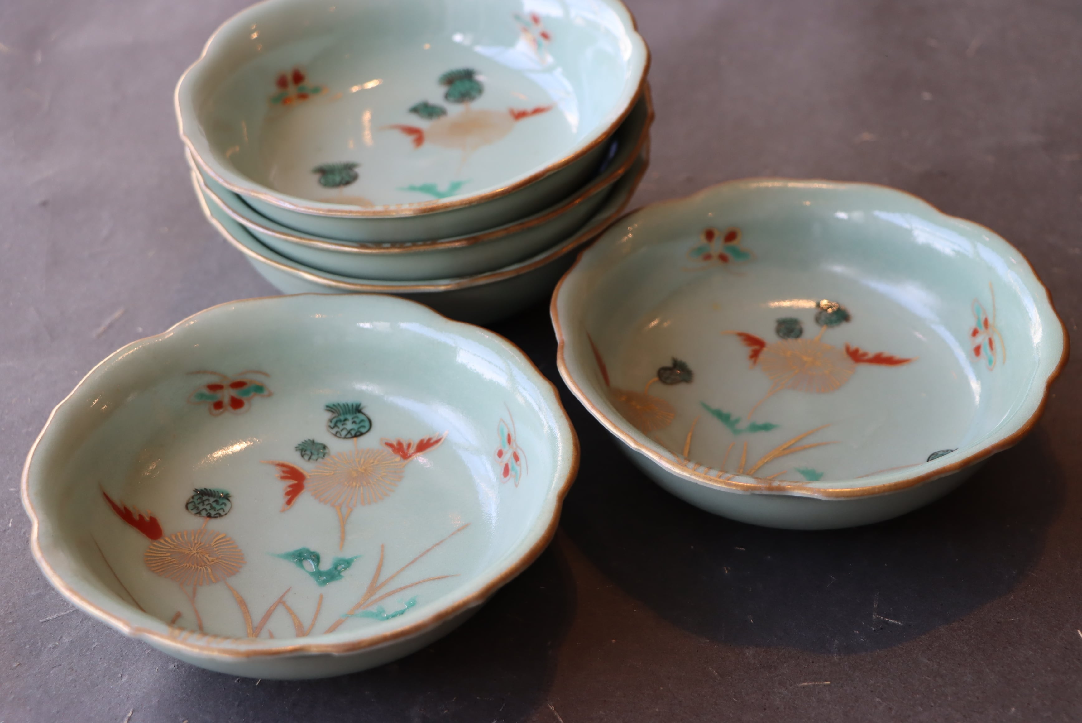 古伊万里 青磁 たんぽぽに蝶文 向付 五客組/Old Imari cup set of 5