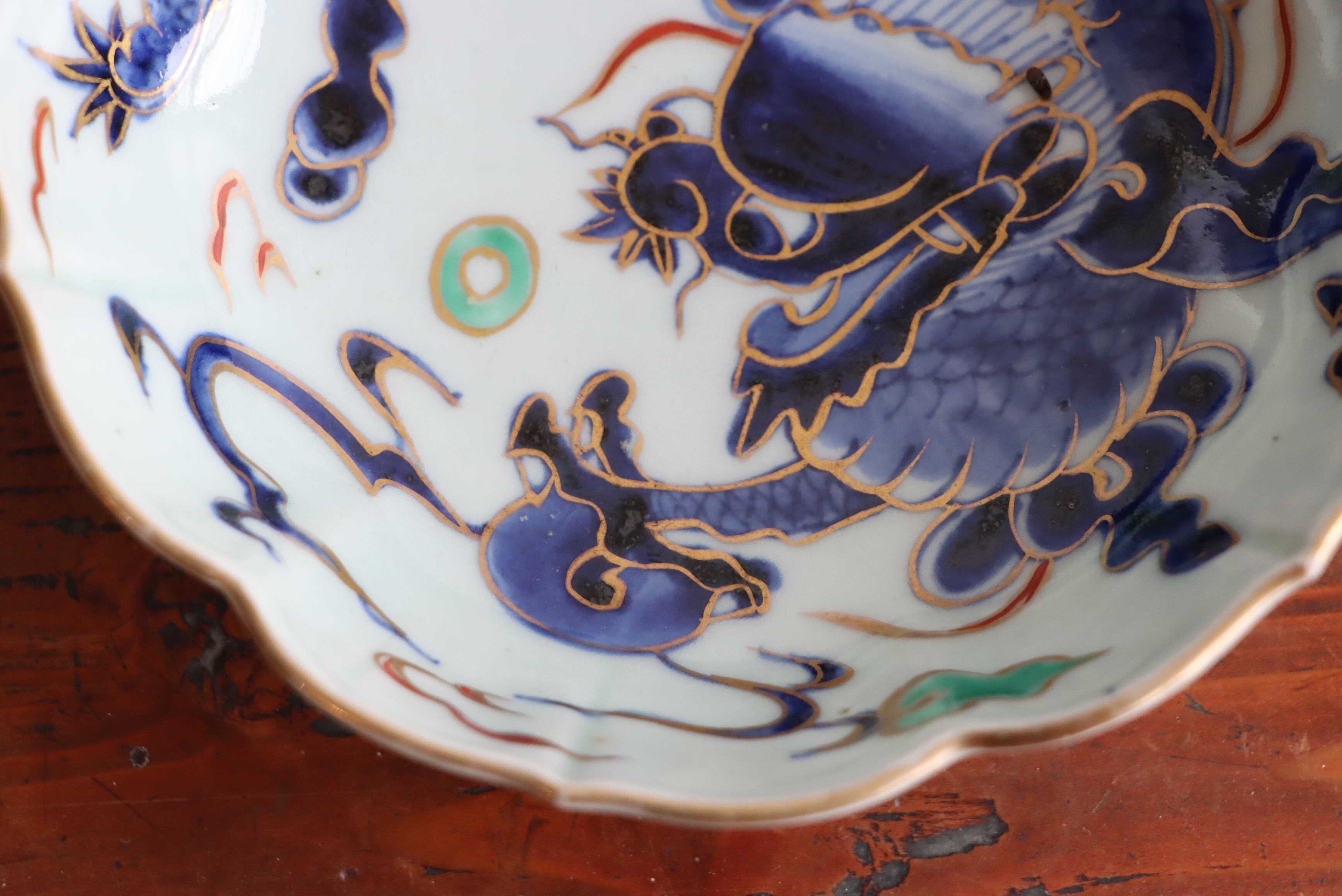 【Old Imari lobed bowl with dragon and jewel design in overglaze enamels.】