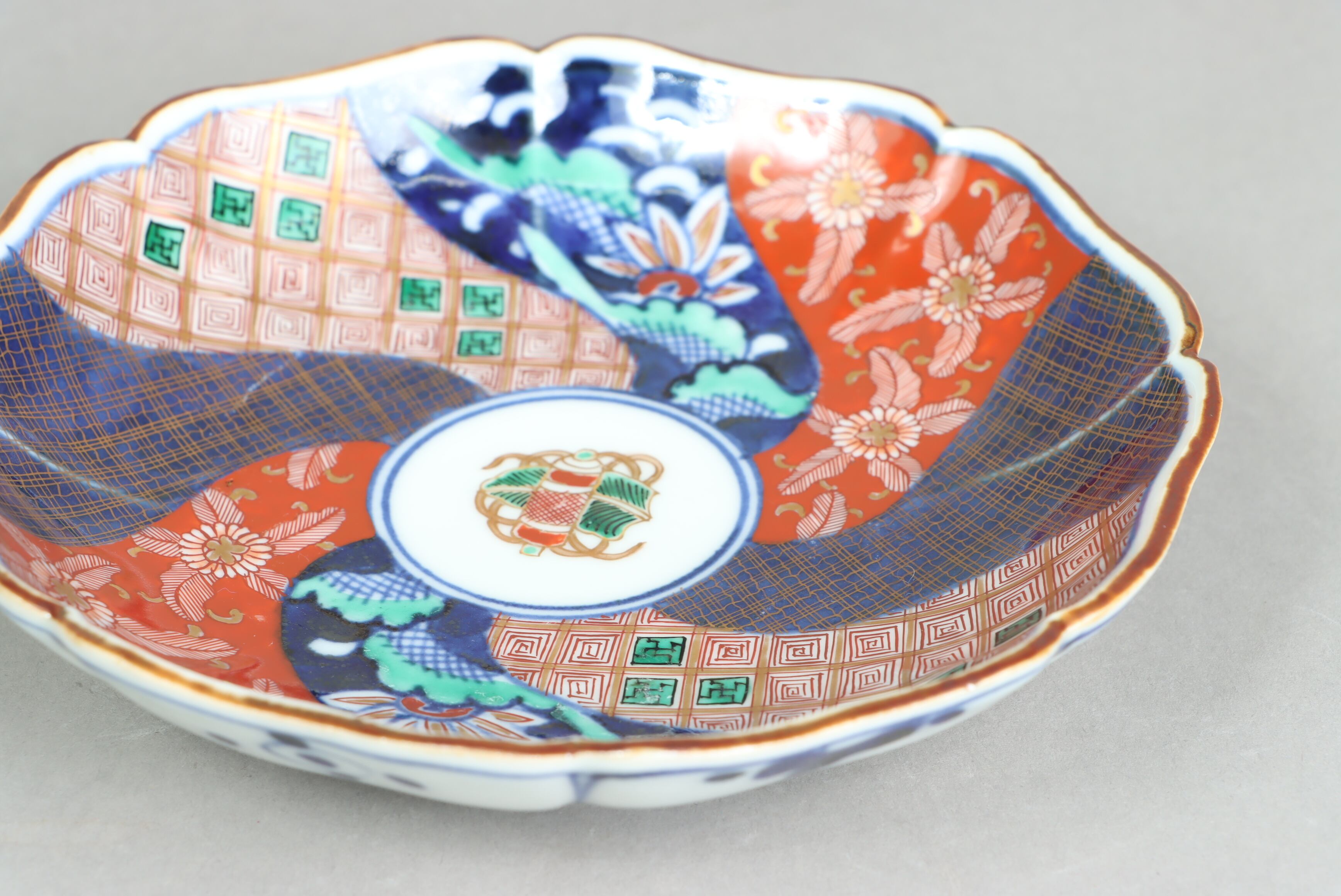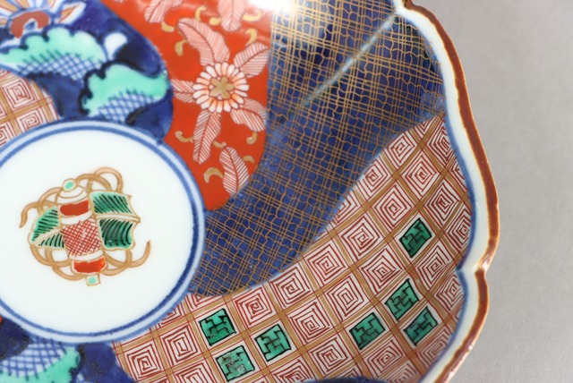 この捻り文中皿は、大胆な構図の中に繊細な筆致で花文や雷文、卍文などが描かれ、当時の職人の美が感じられます。