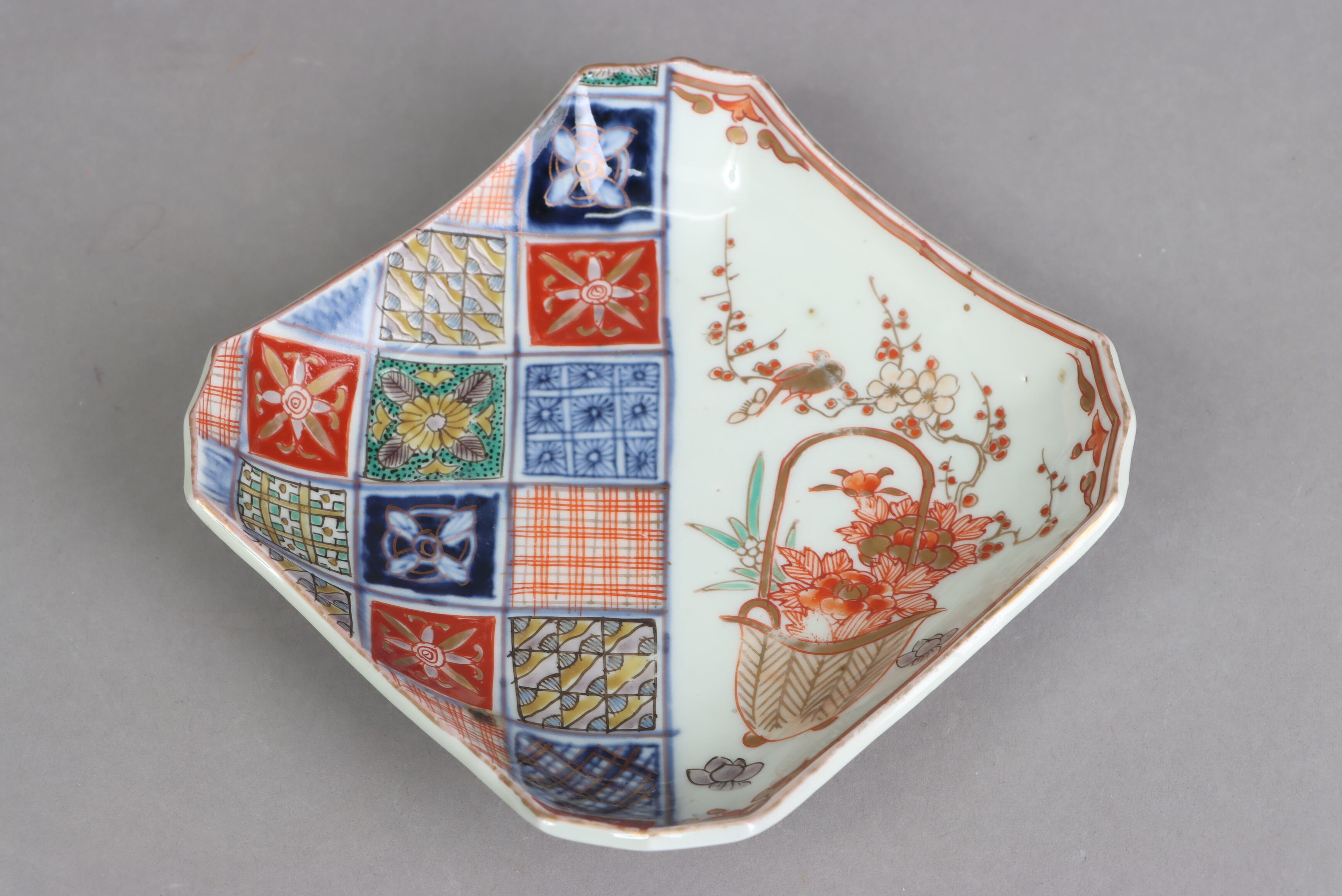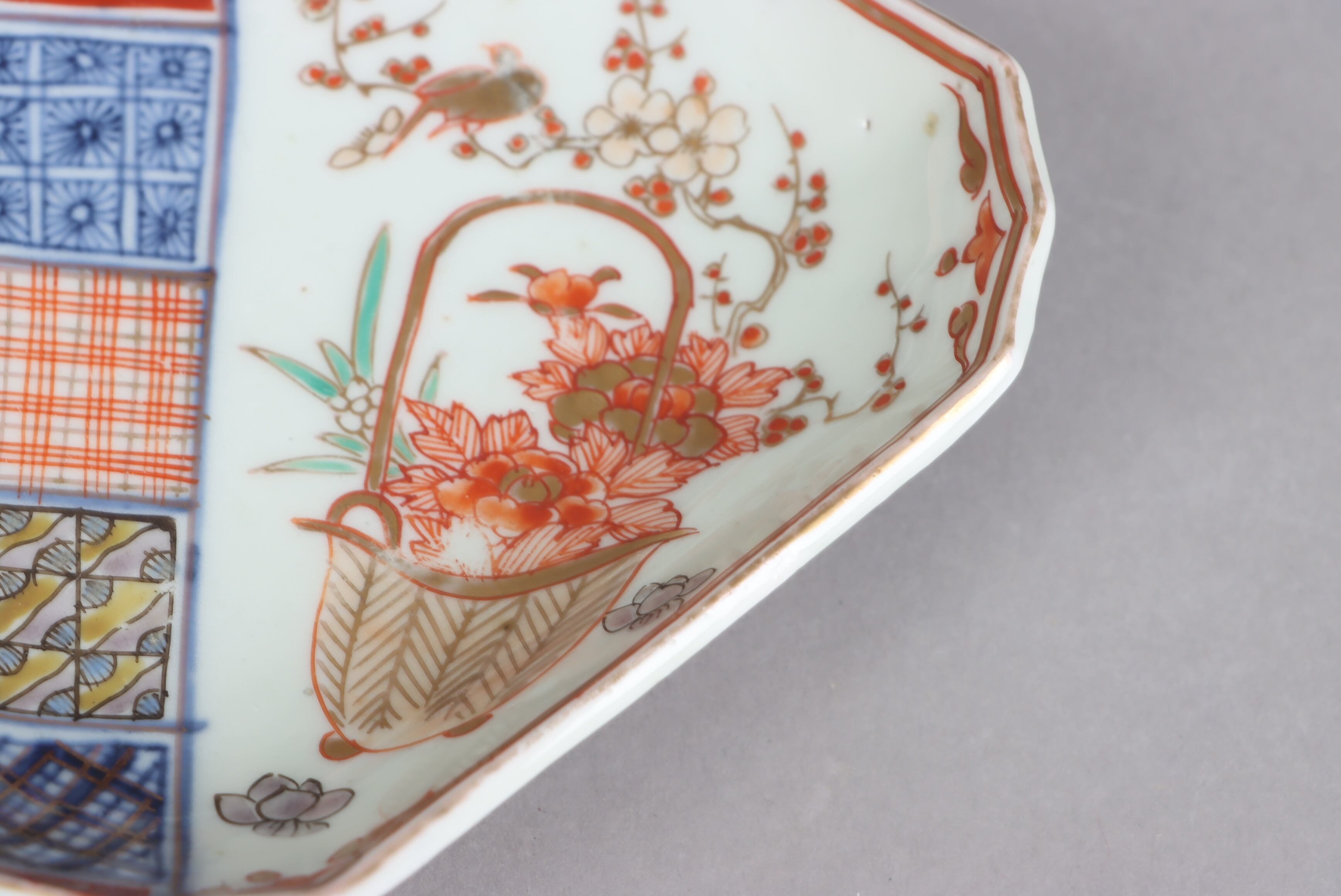 片身には石畳文、もう片身には余白を生かしながら花籠文が描かれています。