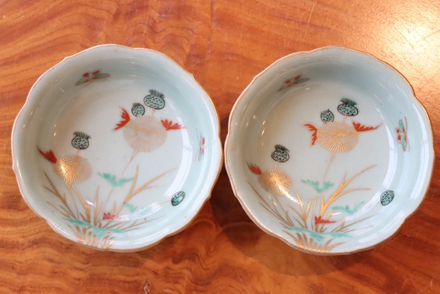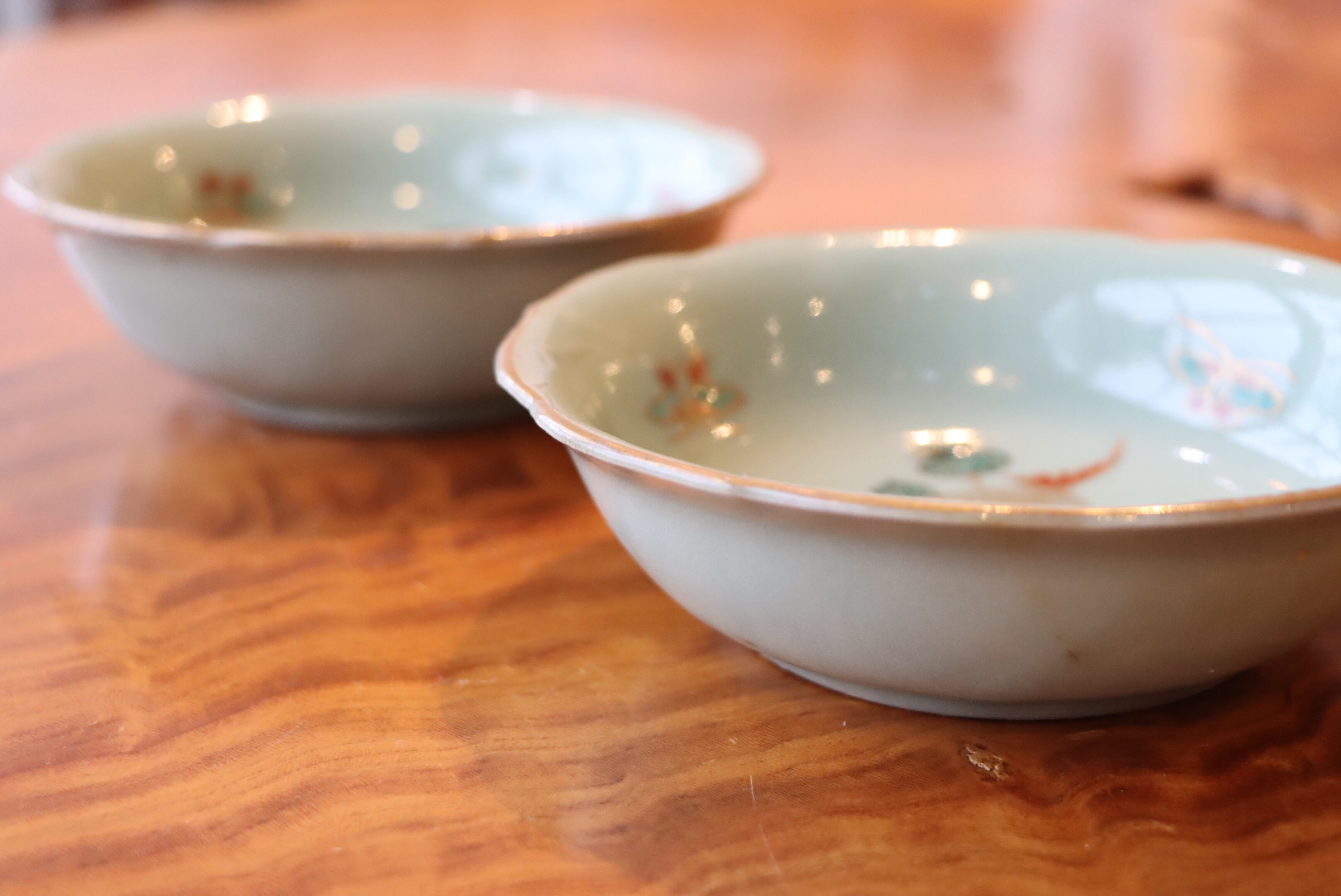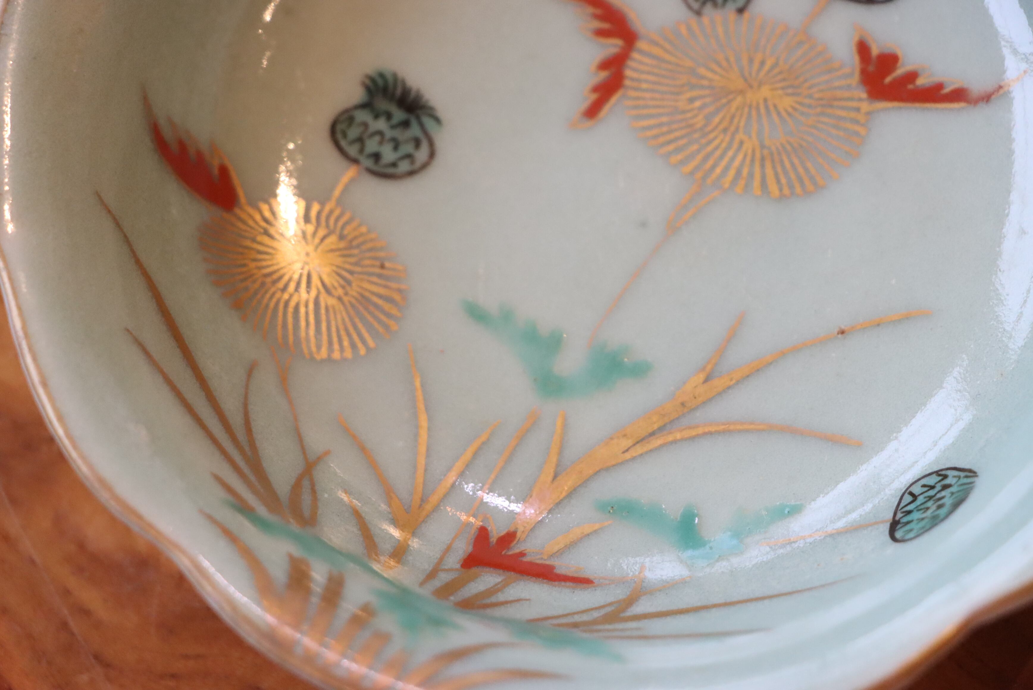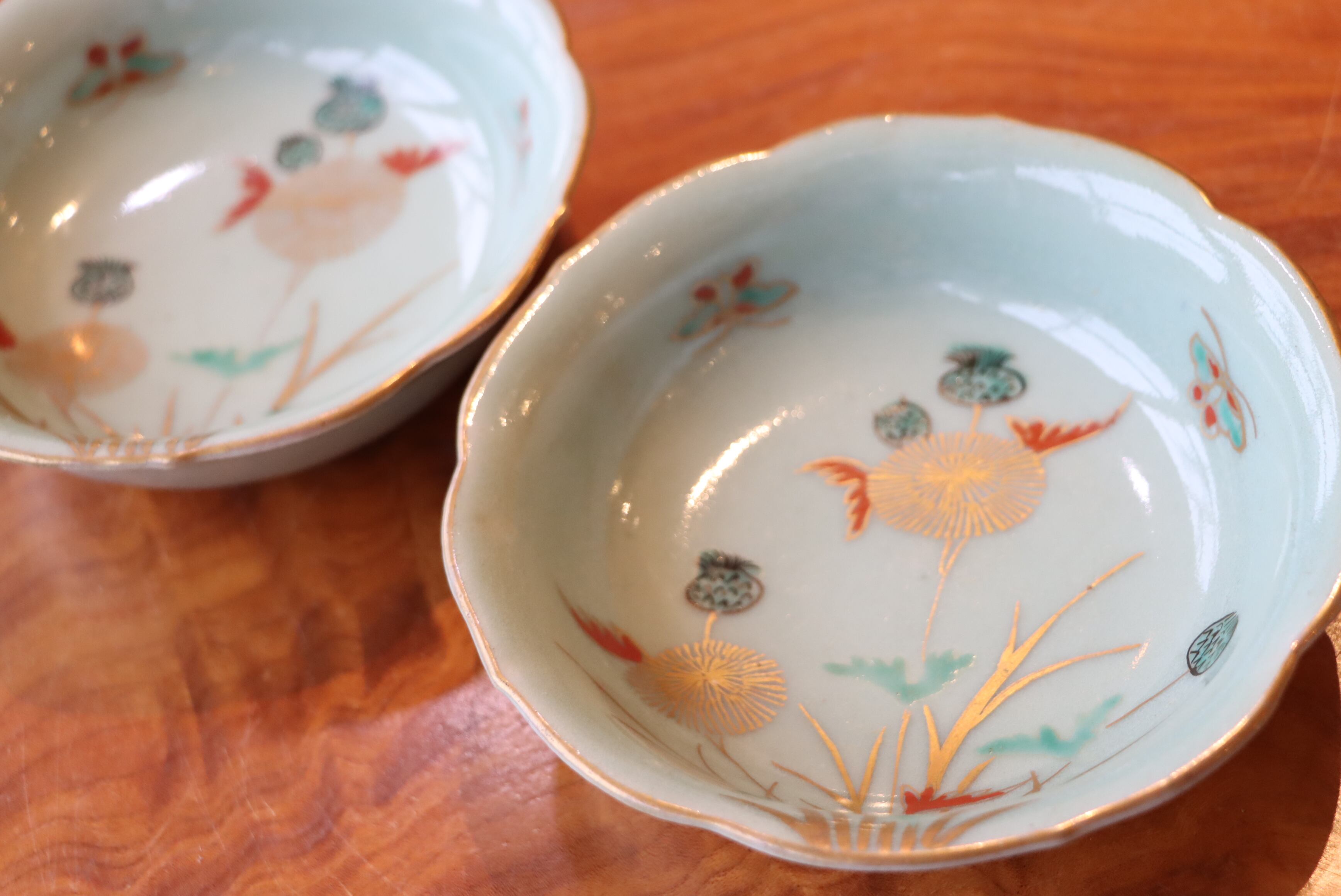 古伊万里 青磁 たんぽぽに蝶文 向付 二客組/Old Imari cup set of 2